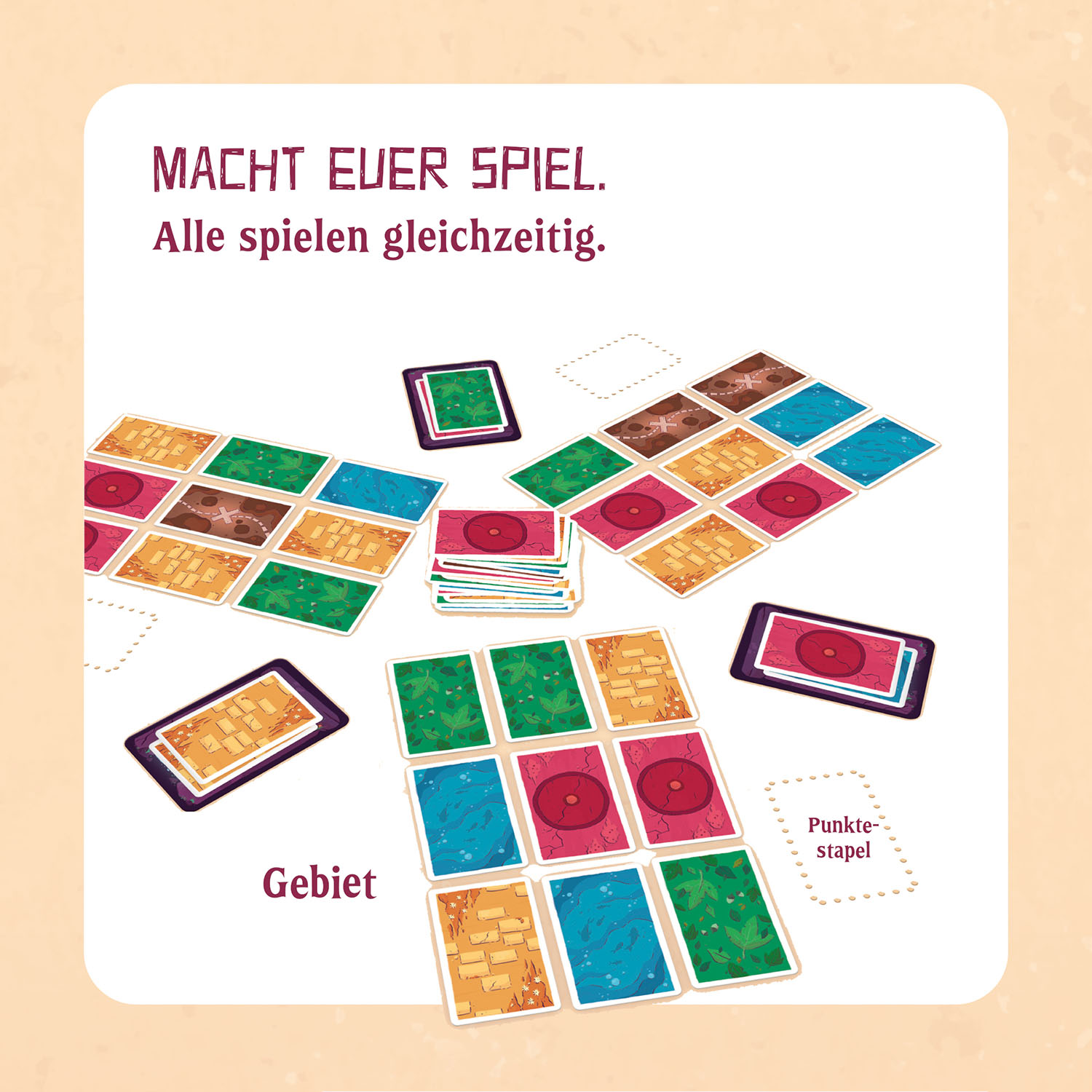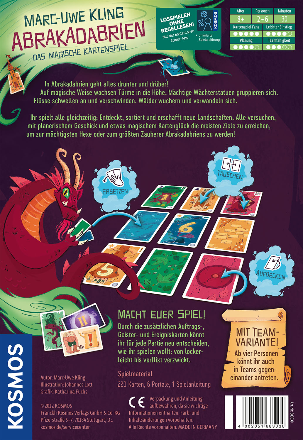 2-6 Spielerinnen und Spieler sind in diesem Kartenspiel damit beschäftigt ihre magischen Landschaften zu erschaffen. Zusätzliche Schatz-, Ereignis- und Auftragskarten sorgen für noch größeren Spielspaß. Die Regeln und der Einstieg sind einfach und alle spielen gleichzeitig. Das Ziel? Das eigene Gebiet hin- und herschieben, verwandeln und dabei Punkte sammeln. Das neue coole Kartenspiel von Erfolgsautor Marc-Uwe Kling für die ganze Familie.