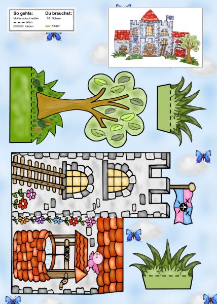 Kreative Kinderbeschäftigung mit viel Spaß: Eine Ritterburg mit ihren Bewohner*innen, einfach anmalen, ausschneiden, zusammenkleben und spielen.