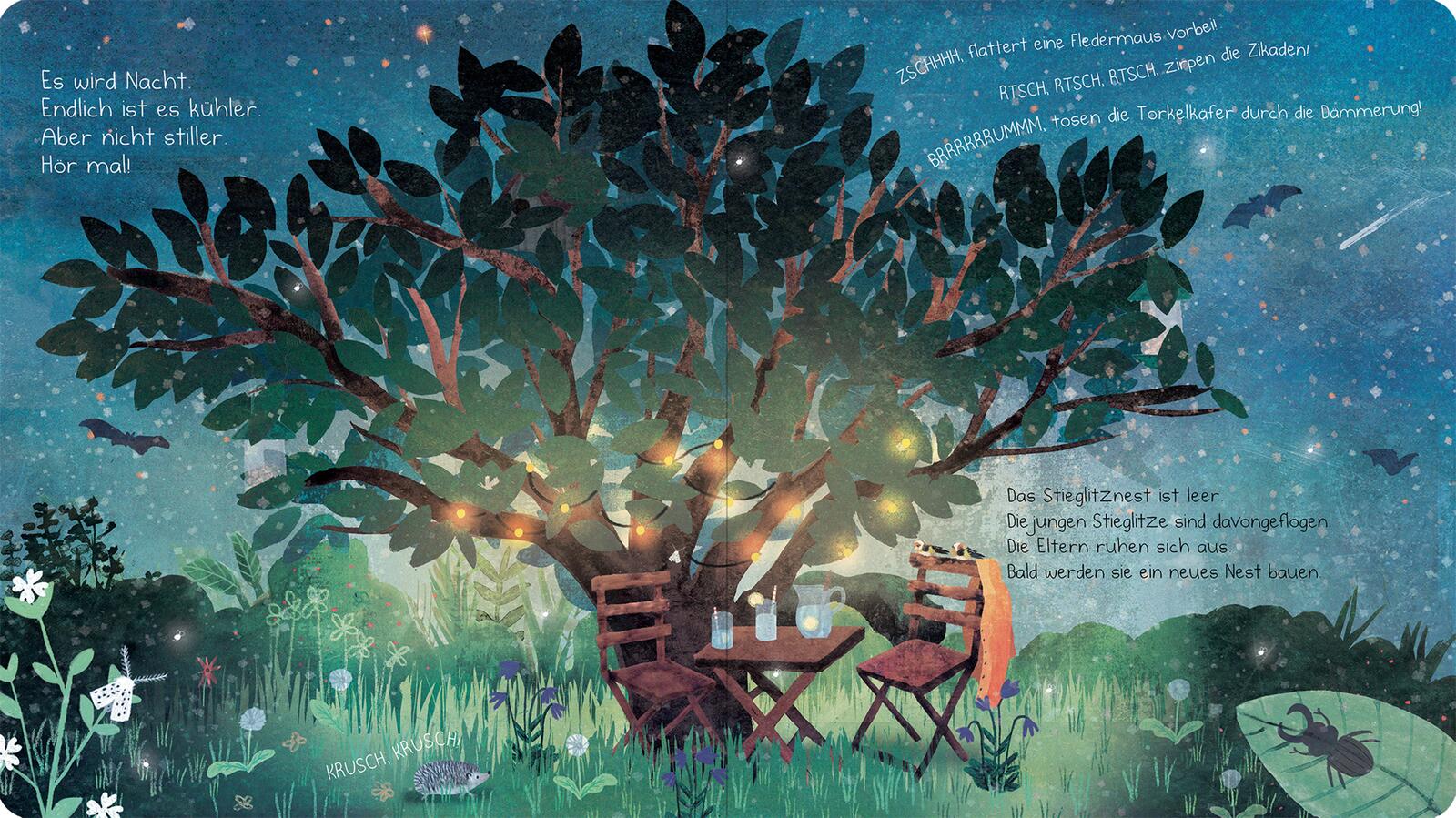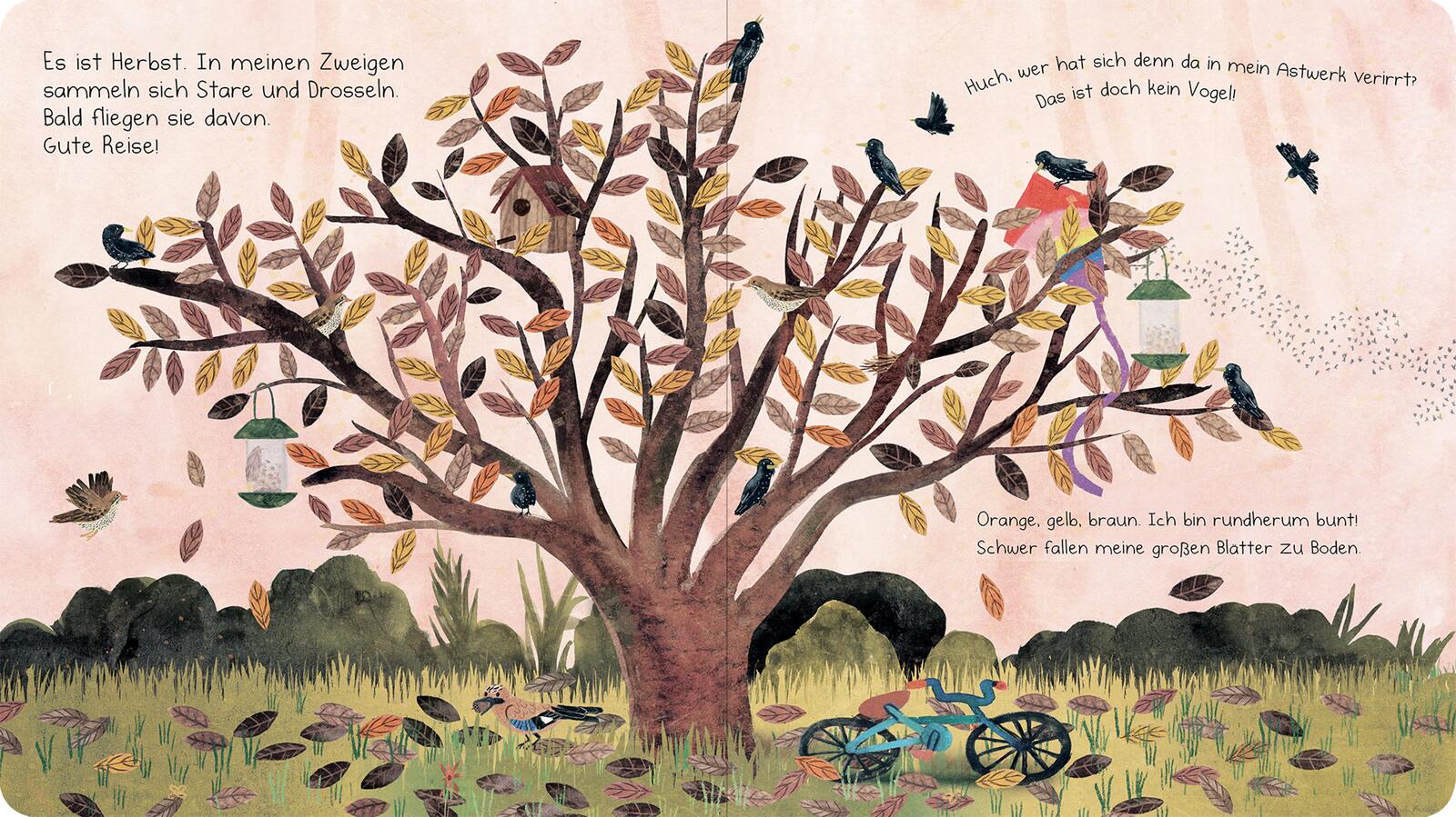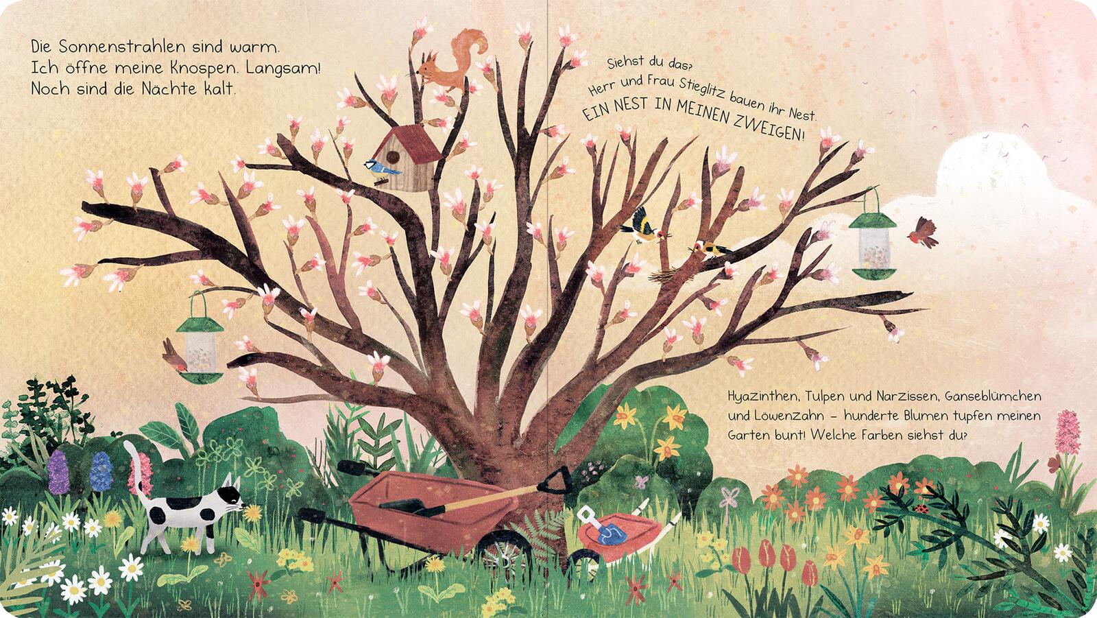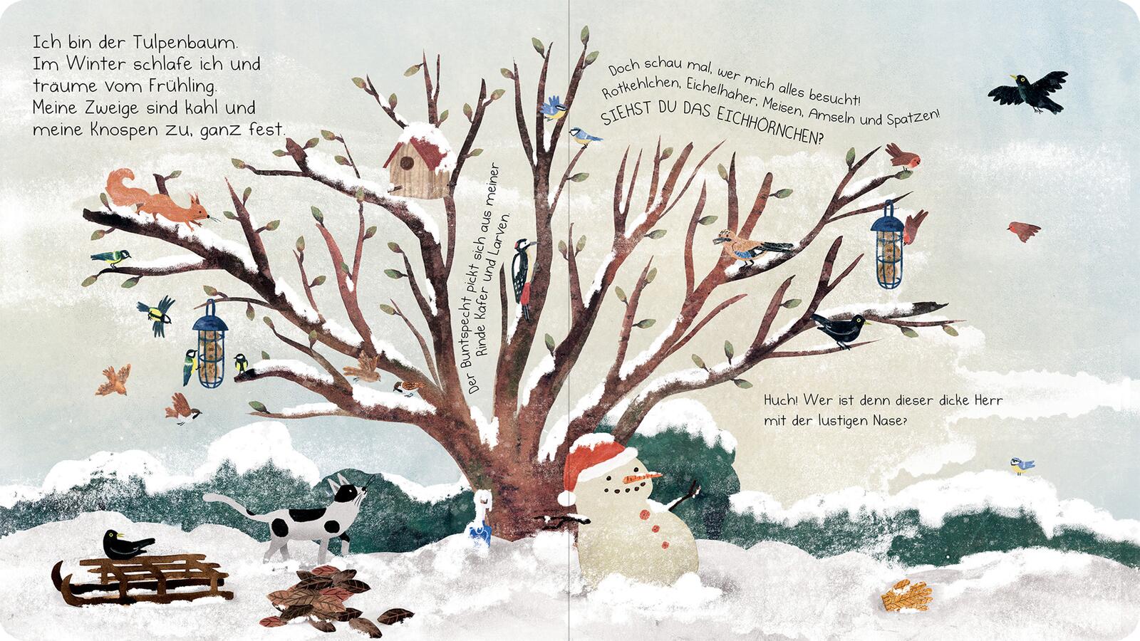 - Beschreibung Wer baut sein Nest in meinen Zweigen?Ich bin der Tulpenbaum. Schau mal, wer mich alles besucht: Rotkehlchen, Meisen, Amseln und sogar ein Eichhörnchen. Im Frühjahr bauen die Stieglitze ihr Nest in meinen Zweigen. Im Sommer spenden meine Blätter Schatten. Im Herbst färbe ich mich bunt und die Zugvögel sammeln sich in meinen Ästen. Im Winter schlafe ich und träume schon vom nächsten Frühling … Ein poetisches Pappbilderbuch über den Zauber der Jahreszeiten und die kleinen Wunder der Natur.Die Natur im Jahreslauf Im Garten gibt es zu jeder Jahreszeit etwas Spannendes zu entdecken! Aus der Sicht eines Magnolienbaums wird auf lebendige Weise erzählt, was im Frühling, Sommer, Herbst und Winter in der Natur passiert und welchen Tieren und Pflanzen der Baum ein Zuhause bietet. Welche Vögel sind auch im Winter an den Futterspendern anzutreffen? Wer kehrt erst im Frühling zurück? Welche Blumen blühen im Sommer? Und wie verändert sich die Natur im Herbst? Stimmungsvolle Texte und wunderschöne Illustrationen laden kleine Leser ab 2 Jahren dazu ein, die Jahreszeiten und Tiere im Garten zu entdecken.• Allererstes Sachwissen: Das Bilderbuch vermittelt spielerisch erste Sachinformationen über Pflanzen, Tiere und Kreisläufe in der Natur • Vorlesen für die Kleinsten: Die stimmungsvollen Texte und detailreichen Bilder erzählen auf jeder Seite viele kleine Geschichten und eignen sich daher ideal zum Vorlesen für Kinder ab 24 Monaten • Perfekt für kleine Kinderhände: Mit dicken Pappseiten und im handlichen Format • Geprüfte Qualität: Das Buch unterliegt strengen Sicherheitsanforderungen und regelmäßigen Qualitätskontrollen nach europäischer Spielzeugsicherheitsrichtlinie