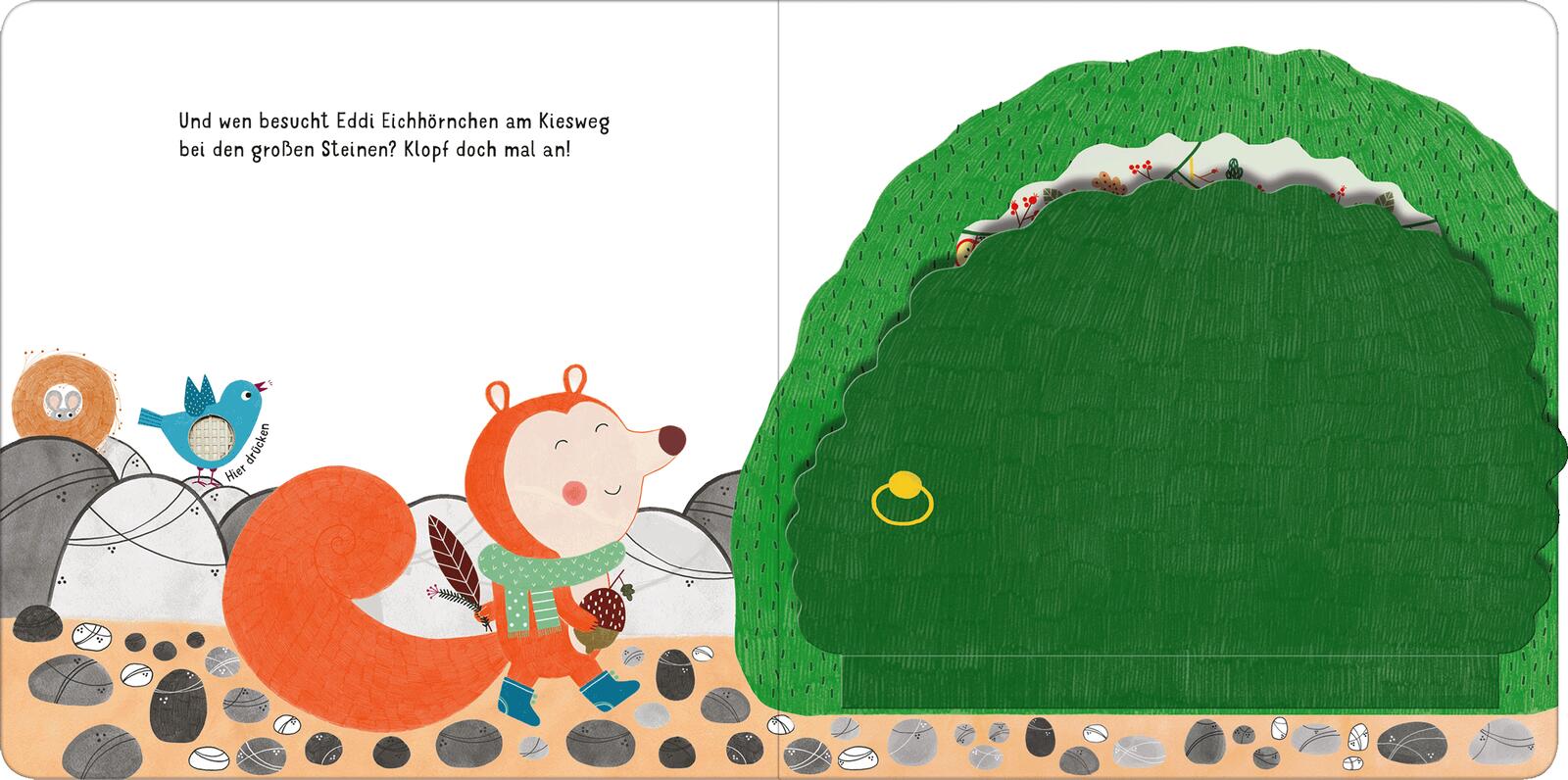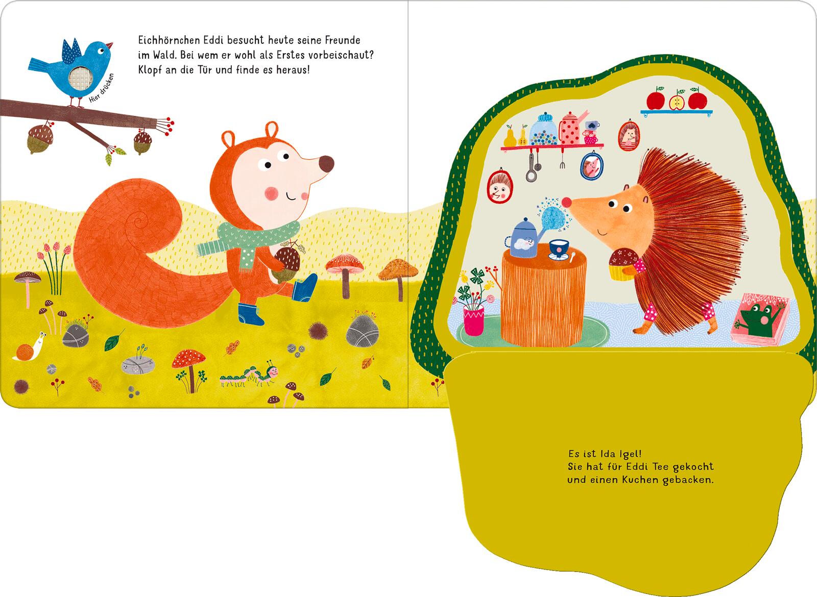 Eichhörnchen Fido hüpft fröhlich durch den Wald. Seine Freunde, der Igel, die Füchse, der Bär, die Eulenkinder und die Wildschweine, sind alle zu Hause in ihren Höhlen. Was sie wohl gerade machen? Begleite Fido auf seinem Waldausflug und finde es heraus. Klopf laut an die Türen und hör genau! Kannst du erraten, wer sich dahinter verbirgt?