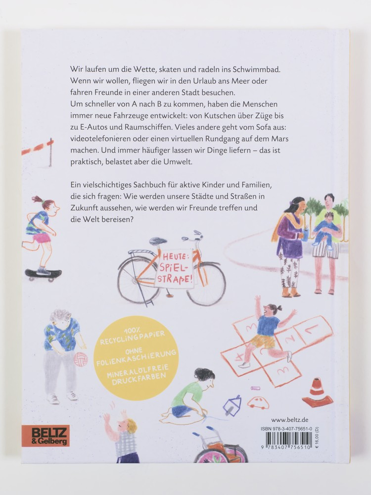 Menschen sind ständig unterwegs, laufen, radeln, skaten. Damit sie schneller von A nach B kommen, haben sie Fahrzeuge entwickelt. Von Kutschen, Flößen und Segelfliegern zu E-Autos und Raumschiffen. Auch virtuell können wir uns bewegen, videochatten oder einen Rundgang auf dem Mars machen. Immer häufiger lassen wir Dinge liefern - das ist praktisch, belastet aber die Umwelt. Ein vielschichtiges Sachbuch für aktive Kinder und Familien, die sich fragen: Wie werden unsere Städte in Zukunft aussehen, wie werden wir Freunde treffen, zur Schule kommen und die Welt bereisen? Bewegung ist immer und überall: Erde: Erdrotation, Wind, Wasser & Schwerkraft Natur: Zugvögel, Pflanzen neigen sich der Sonne zu Mensch: Blutkreislauf, Zellteilung, Gedankenreisen und Gehirnjogging Früher, heute und in Zukunft: Menschheit: Nomadentum, Entdeckerreisen, Migration und Flucht Virtuelle Mobilität: Arbeiten, Lernen und Reisen Neue Technik: E-Mobilität, Wasserstoff, selbstfahrende Autos, Hyperloop, Lufttaxis Entdecke unsere Sachbücher mit den relevanten Fragenstellungen unserer Zeit und unserer Zukunft. Für Kinder erklärt. • MÜLL. Alles über die lästigste Sache der Welt. • VOLL UNFAIR! Über Gerechtigkeit und Fairness. • WIE VIEL WÄRMER IST 1 GRAD? Was beim Klimawandel passiert. • OHNE WASSER GEHT NICHTS! Alles über den wichtigsten Stoff der Welt. • DAS IST AUCH MEINE WELT. Wie können wir sie besser machen? • WAS IST ZUHAUSE? Vom Wohnen, Leben, Weggehen und Ankommen. • WIR MENSCHEN UND DAS MEER. Ozeane Nahrung, Strom und Rohstoffe liefern und das Klima beeinflussen. • DIE GANZE WELT STECKT VOLLER ENERGIE. Alles über die Kraft, die uns antreibt. • DIE VIELFALT DER NATUR. Warum wir Biodiversität brauchen und wie wir sie erhalten können. Erforscht die Vielfalt in Natur und Gesellschaft! Wichtige Themen unserer Zeit - anschaulich erklärt Umweltfreundliche Ausstattung, u. a. durch 100 % Recyclingpapier, Öko-Druckfarben und Verzicht auf Folienkaschierung Ansprechend und lebendig illustriert Auch Erwachsene lernen hier noch etwas
