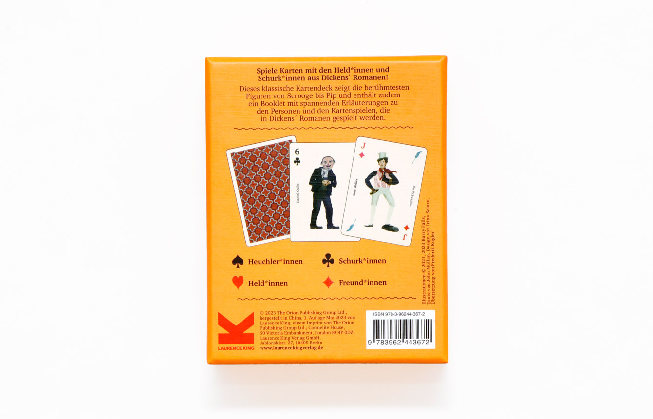 Spielen Sie Karten mit den Held*innen und Schurk*innen aus Dickens´ Romanen! Dieses wunderschöne Kartendeck zeigt die berühmtesten Figuren aus Dickens´ Welt und enthält zudem ein Booklet mit spannenden Erläuterungen zu den Personen und den Kartenspielen, die immer wieder in Dickens´ Romanen beschrieben werden. Ein Muss nicht nur für Bücherwürmer!