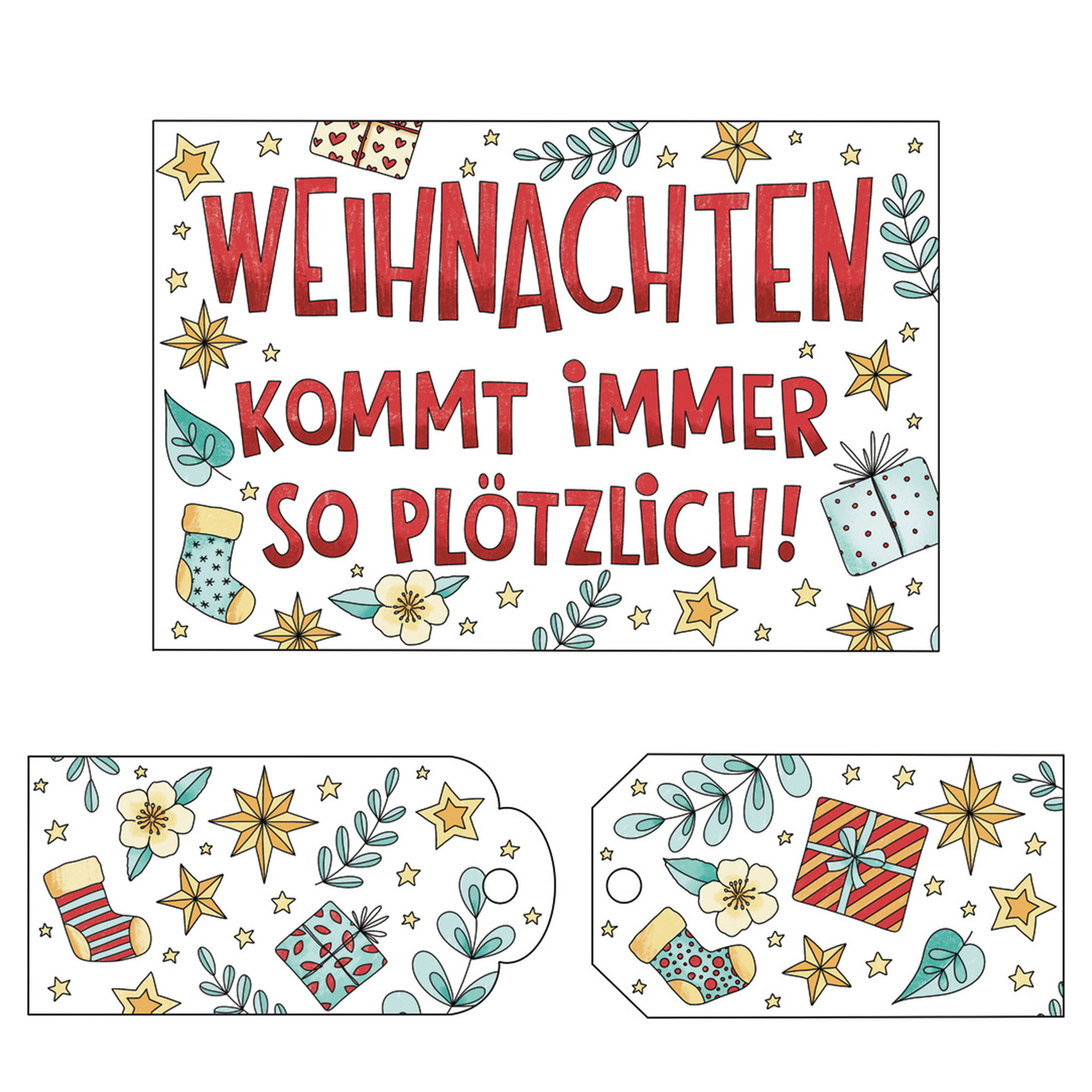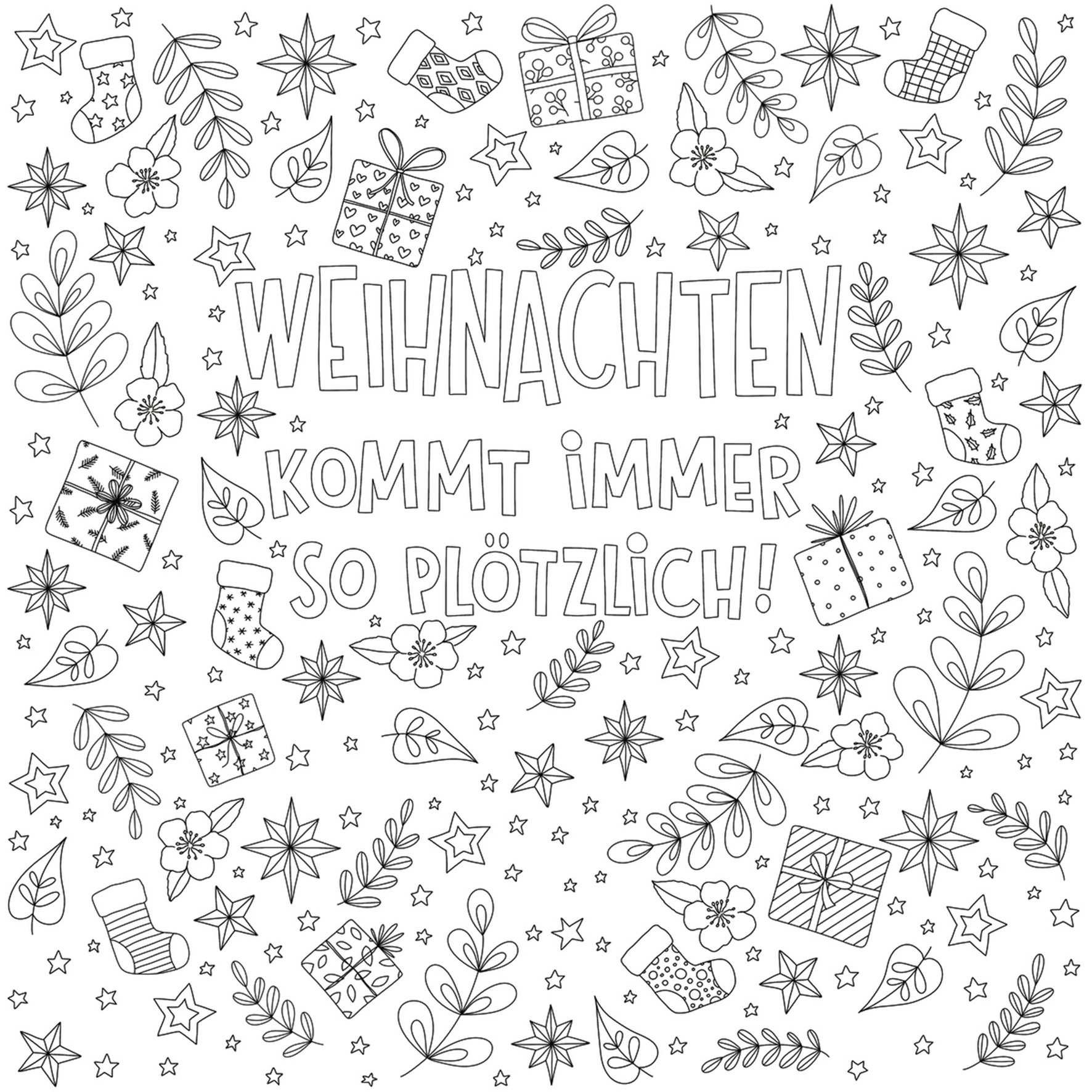 Weihnachten kommt immer so plötzlich! Um die schönste Zeit des Jahres ein wenig bewusster wahrzunehmen, bietet dieser Adventskalender täglich einen humorvollen oder unterhaltsamen Spruch zum Ausmalen. Die frischen Sprüche sind im Handlettering-Stil gezeichnet und umringt von thematisch passenden Streumustern. Die 24 Türchen sind als zunächst geschlossene Doppelseiten gestaltet, die sich dank Perforation einfach öffnen lassen. Zur Inspiration findest du die Ausmalmotive auf den linken Seiten schon beispielhaft bunt gestaltet. Der besondere Bonus: Jedes Ausmalmotiv lässt sich auch als Postkarte und Geschenkanhänger herausschneiden. So entsteht ganz nebenbei persönliche Deko für deine Weihnachtsgeschenke.