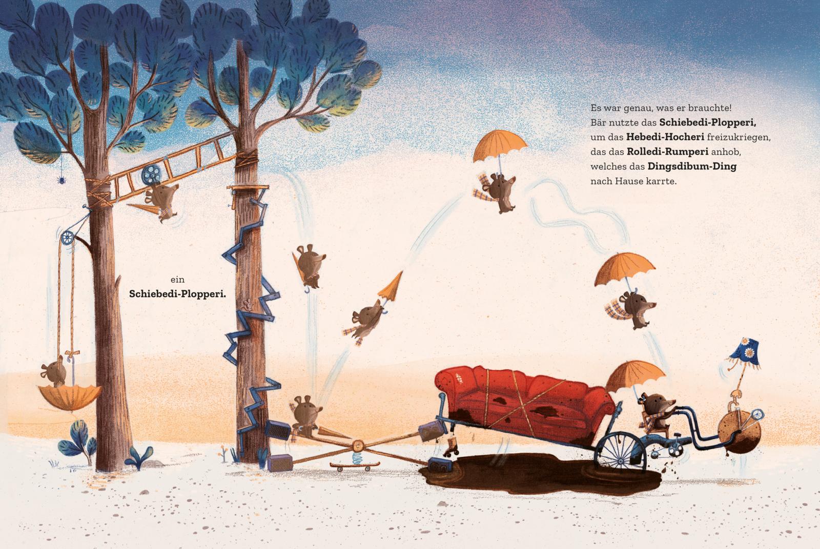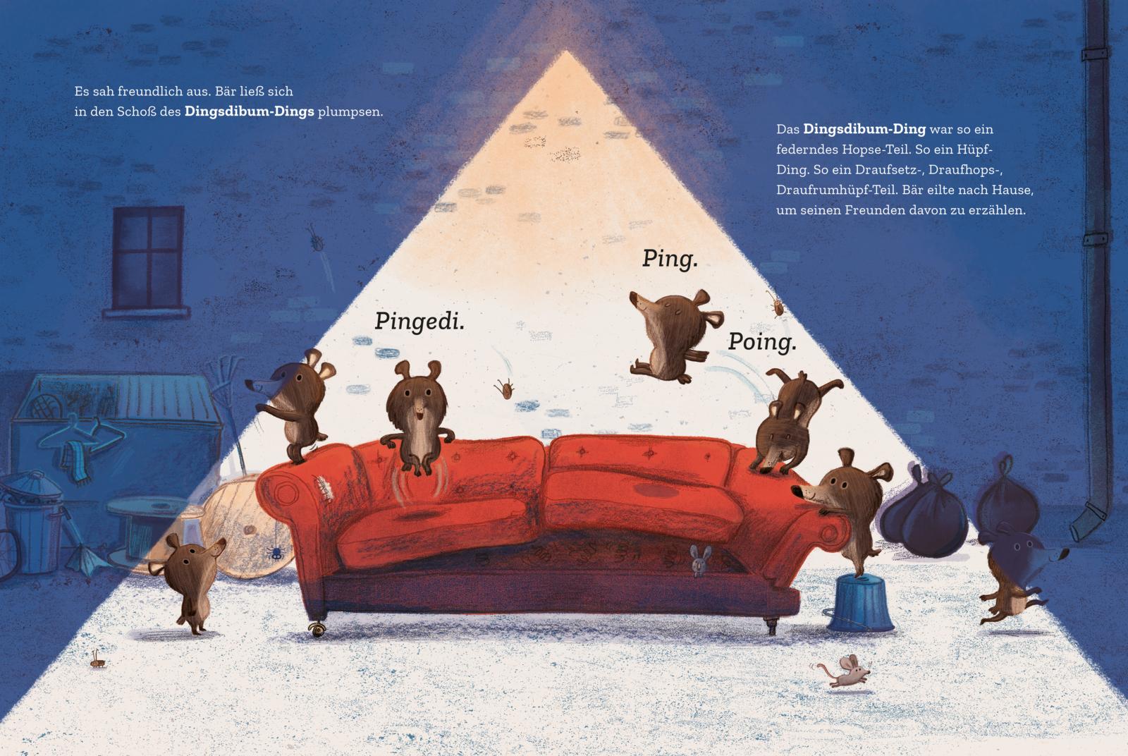 Während alle Tiere im Wald friedlich schlummern, ist der kleine Bär noch kein bisschen müde. Neugierig erkundet er die nahegelegene Stadt und entdeckt etwas Faszinierendes: ein riesiges, weiches Ding, auf dem man herrlich herumspringen und klettern kann. Diesen sensationellen Fund – in Wirklichkeit ein altes Sofa – muss der kleine Bär unbedingt seinen Freunden im Wald zeigen. Aber wie? Die ganze Nacht baut er aus Schrott an einem fantastischen Transportgefährt.