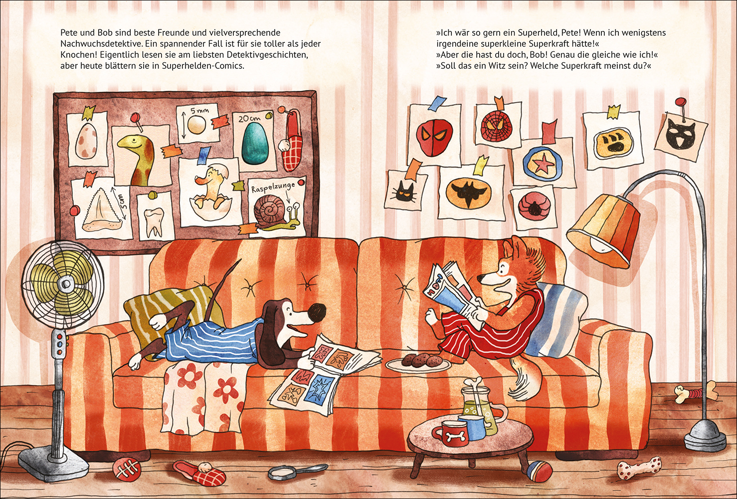 - Beschreibung Pete und Bob sind beste Freunde und vielversprechende Nachwuchsdetektive. Ein spannender Fall ist für sie toller als jeder Knochen! Eigentlich lesen sie am liebsten Detektivgeschichten, aber heute blättern sie in Superhelden-Comics. Und wünschen sich nichts mehr, als auch Superhelden zu sein! Dabei stellen sie fest: Mit ihren guten Nasen haben sie ja bereits eine tolle Superkraft! Sie hören sich in der Nachbarschaft um, und finden noch mehr Tiere mit außergewöhnlichen Fähigkeiten: die Eule mit ihrer einzigartigen Nachtsicht, den Geparden, der extrem schnell rennen kann, die Fledermaus mit ihrer Echoortung … und viele mehr! Ein herrlich originelles Bilderbuch, voll von lebendig-bunten Tierfiguren mit besonderen »Superkräften«, über die die kleinen Leserinnen und Leser jede Menge lernen.