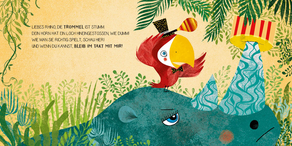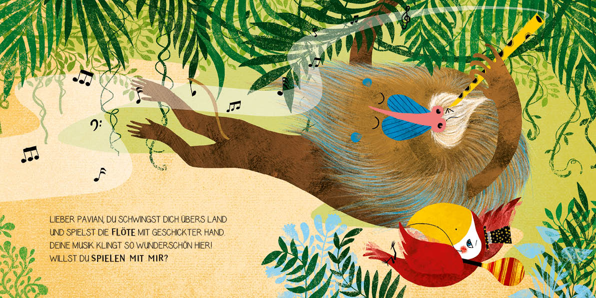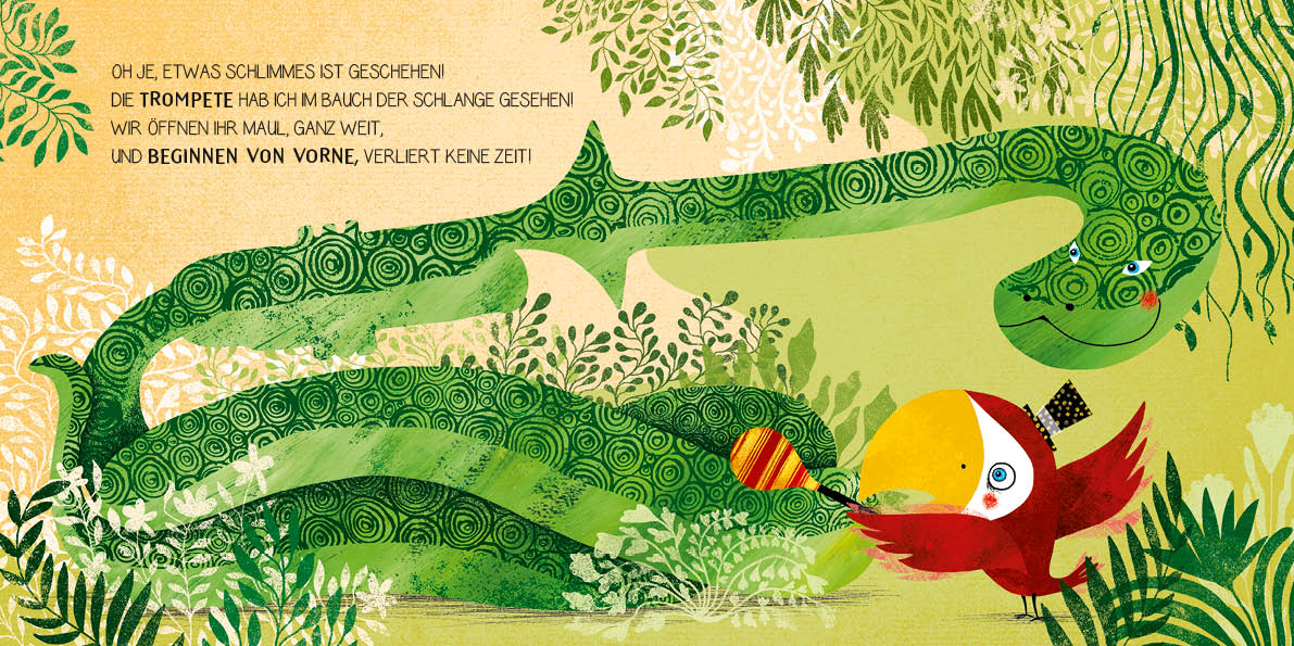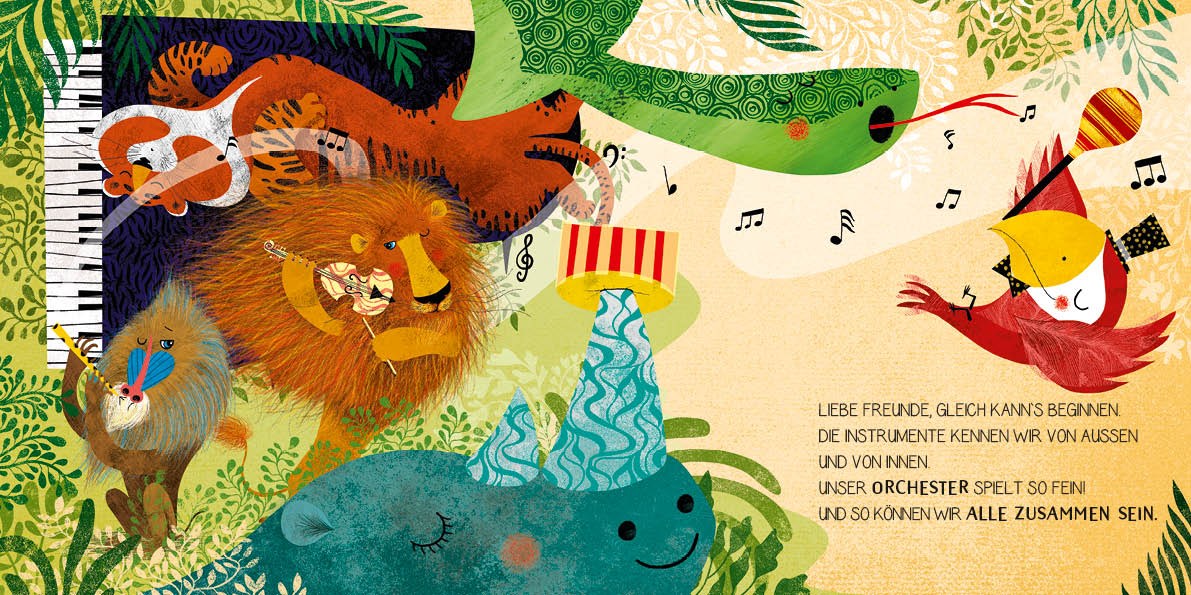 Papagei Teo hat einen Traum: ein eigenes Orchester im Dschungel! Das Rhinozeros soll die Pauke spielen, Herr Pavian die Flöte, Frau Tiger das Klavier, die Schlange die Trompete – oops, jetzt hat sie gerade ihr Instrument verschluckt ... Du hilfst den Tieren beim Musizieren: Berühre mit deinem Taktstock die Seiten dieses Bilderbuches und schon erklingt eine großartige Dschungelsinfonie.