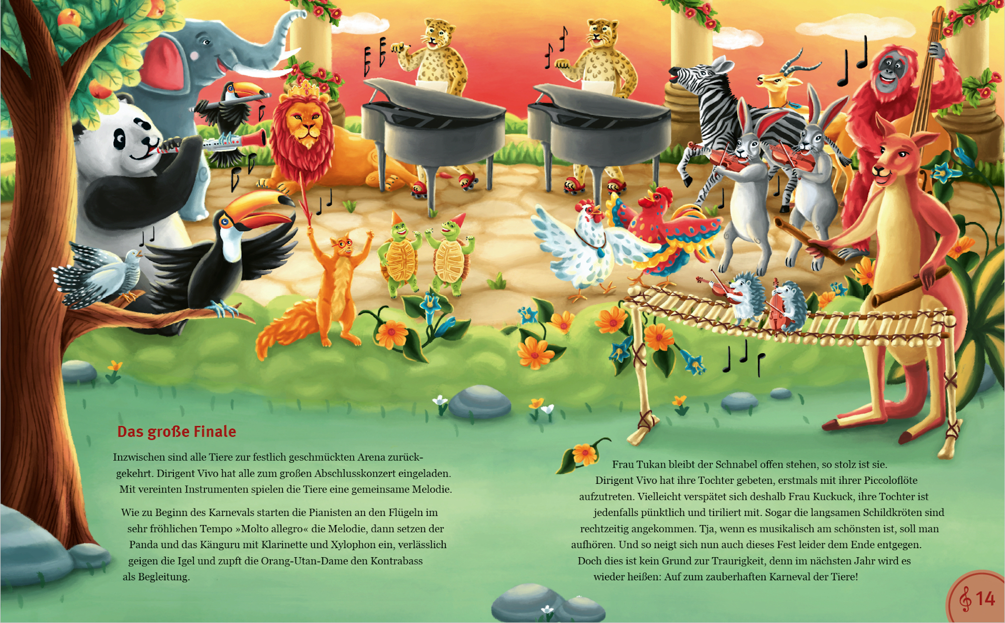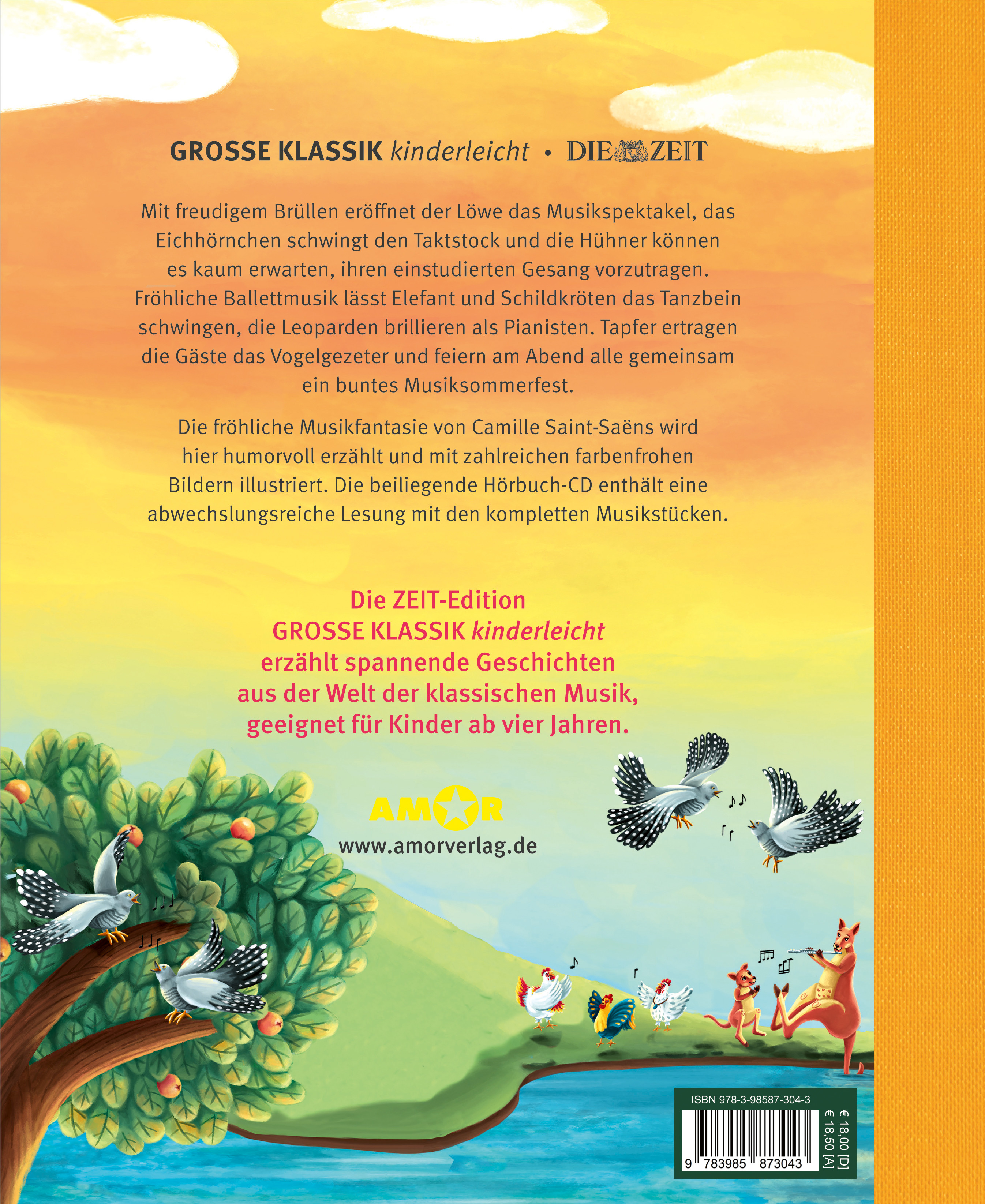 - Beschreibung Mit freudigem Brüllen eröffnet der Löwe das Musikspektakel, das Eichhörnchen schwingt als Dirigent den Taktstock und die Hühner können es kaum erwarten, ihren einstudierten Gesang vorzutragen. Fröhliche Ballettmusik lässt Elefant und Schildkröten das Tanzbein schwingen. Äußerst taktvoll ist die lustige Hüpfeinlage der Kängurus. Die Leoparden brillieren wie jedes Jahr als Pianisten. Tapfer ertragen die Gäste Vogelgezeter und schrilles Getriller der Flöten. Am Abend feiern alle Tiere gemeinsam ein buntes Sommerfest. Die fröhliche Fantasie des Komponisten Camille Saint-Saëns (1835–1921) wird für Kinder ab fünf Jahren von Bert Alexander Petzold neu erzählt und ist von der libanesischen Künstlerin Maya Akiki farbenfroh und stimmig illustriert. Der Buchausgabe liegt eine CD mit einer inszenierten Lesung mit Luca Zamperoni und mit Geräuschen sowie dem ungekürzten Originalstück bei. Der Titel erscheint innerhalb der Serie »Große Klassik kinderleicht. DIE ZEIT-Edition«.