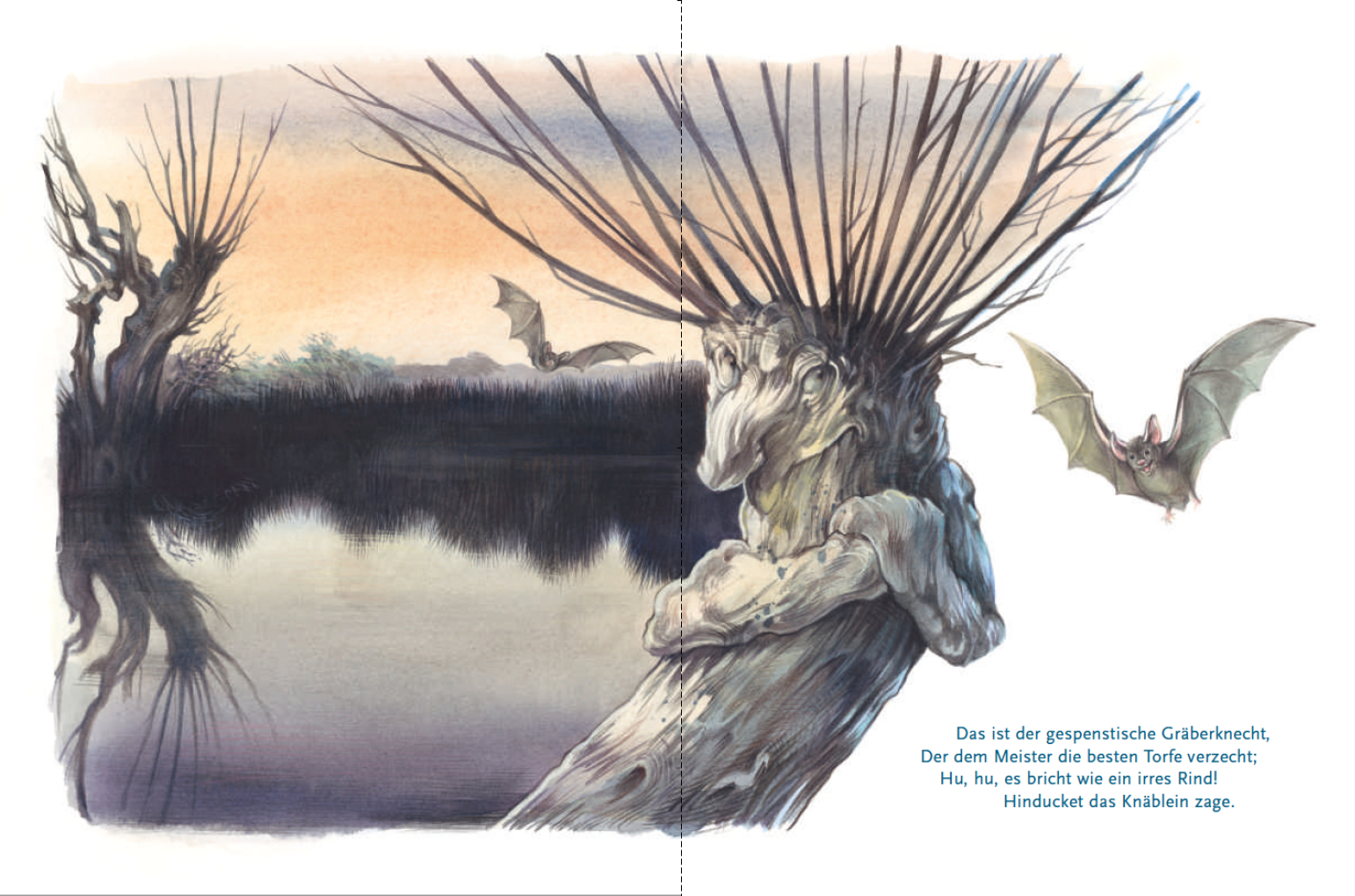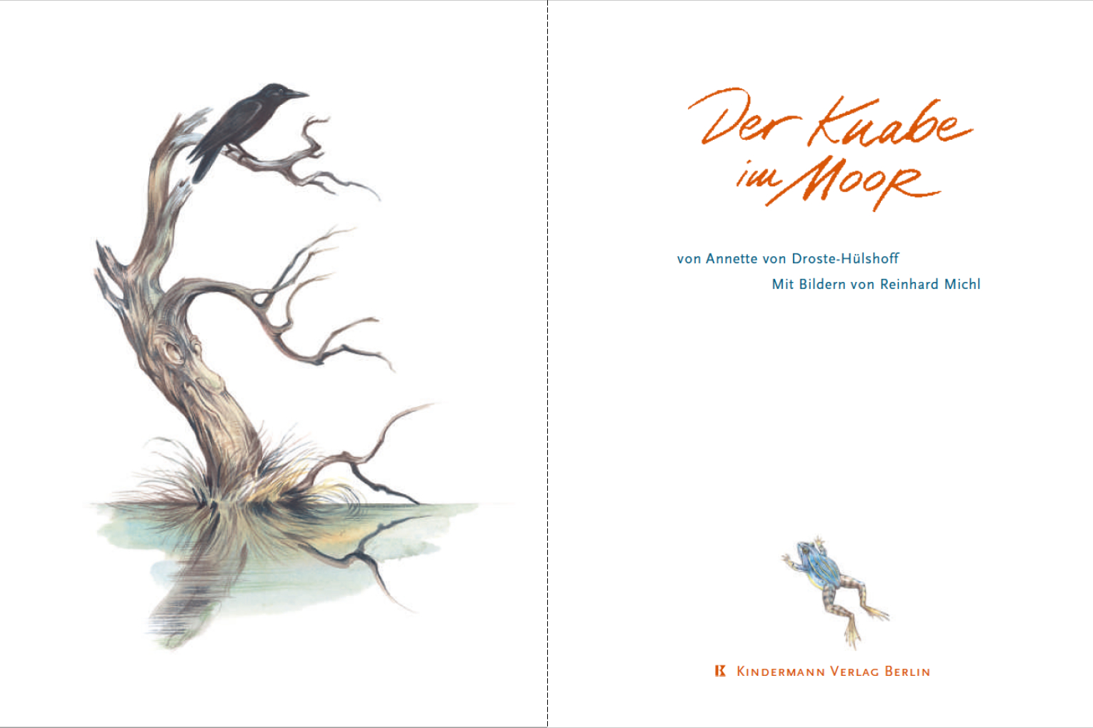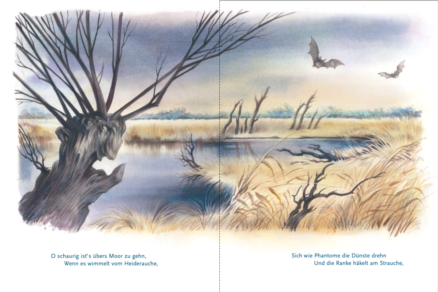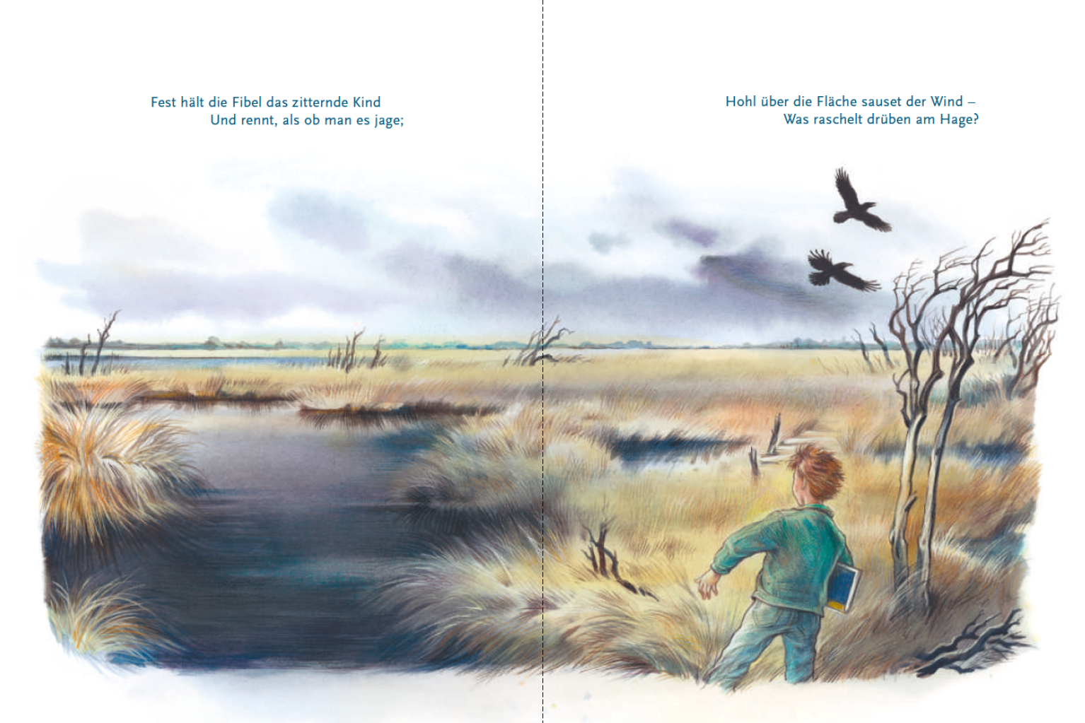Der Knabe im Moor: Schaurig schön präsentiert sich Annette von Droste-Hülshoffs Ballade um einen Knaben, der auf seinem Nachhauseweg gezwungen ist, ein Moor zu durchqueren. Angeregt durch die unheimliche Landschaft, die er durchwandert, vermischen sich Realität und Phantasie des Jungen. Er malt sich gruselige Szenarien aus und muss viele Ängste überwinden, bis er endlich glücklich im sicheren Zuhause ankommt. Reinhard Michls von zahllosen eigenen Moorspaziergängen inspirierten Illustrationen setzten die atmosphärische Dichte der Sprache Droste-Hülshoffs gekonnt in beeindruckende Bilder um.