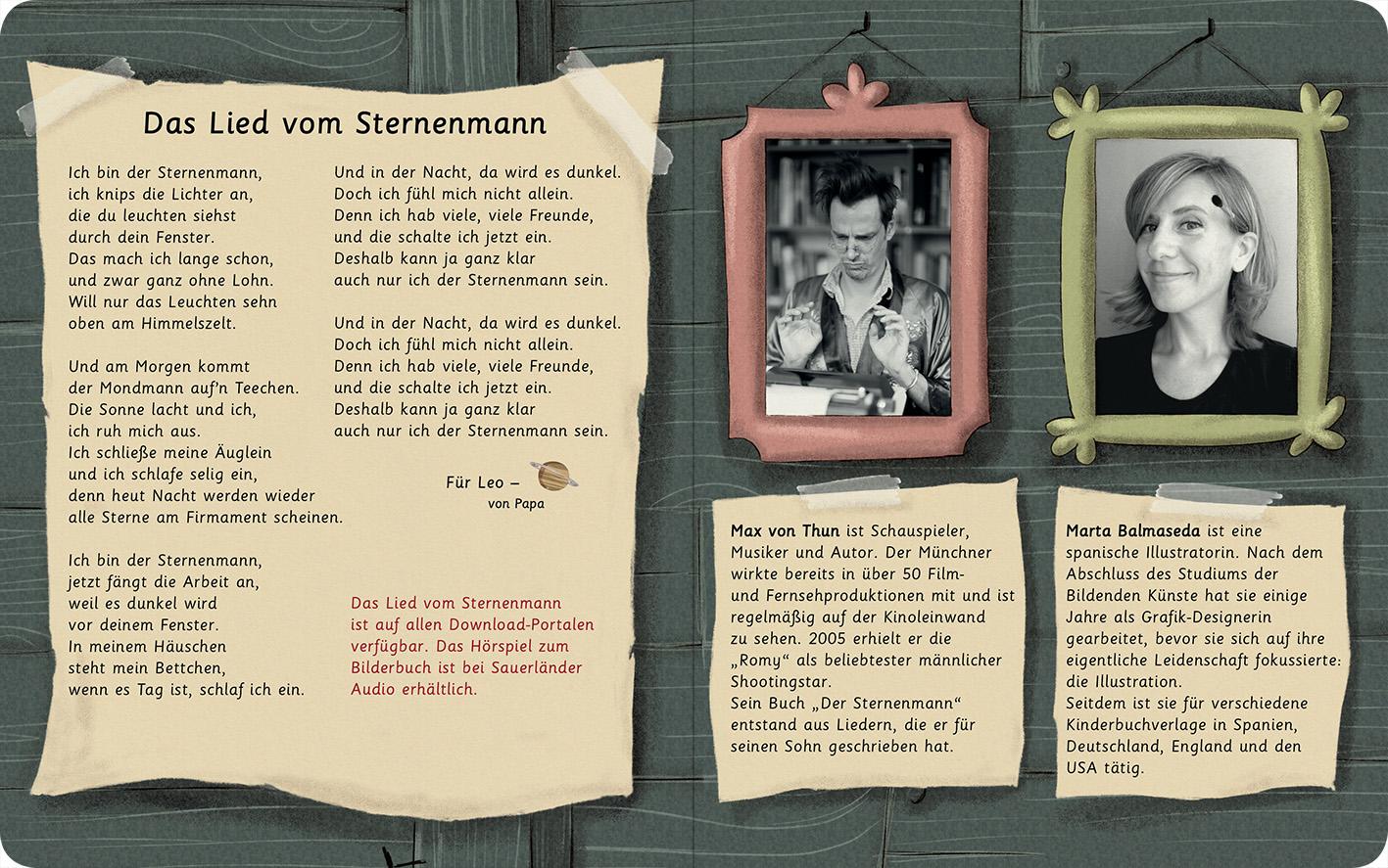 - Mit Sternenmann-Song: Das Gutenachtlied zum Bilderbuch, das Max von Thun für seinen Sohn geschrieben hat, ist auf allen gängigen Download-Portalen sowie als Hörspiel bei sauerländer audio erhältlich