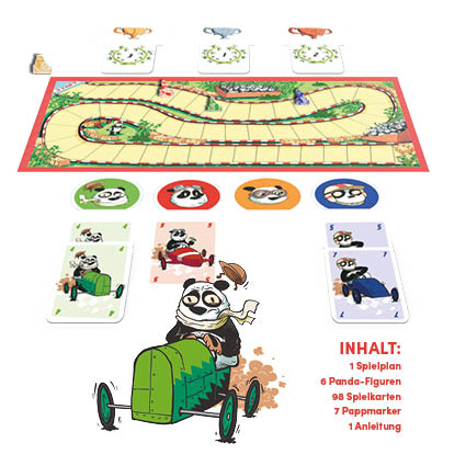 - Beschreibung Wetten platzieren, Rennen fahren, Preisgelder kassieren!Bei den Seifenkistenrennen in Pandama ist nicht alles schwarz oder weiß – und nicht immer ist der erste Platz auch der lukrativste! Und alle manipulieren, was das Zeug hält, um ihren geheimen Favoriten auf die richtige Position zu bringen ... Schon beim Platzieren deiner Wetten musst du dich entscheiden: Setzt du deine besten Karten, um am Ende einen großen Reibach zu machen, fehlen dir diese Karten, um das Rennen zu deinen Gunsten zu beeinflussen. Bist du aber zu vorsichtig, schnappen dir die anderen die besten Preise weg. Über fünf Rennen musst du dich beweisen. Wer wettet am cleversten?Inhalt:1 Spielplan6 Panda-Meeple98 Spielkarten7 Pappmarker1 AnleitungSpielprinzip: Zu Beginn eines Rennens wettet man mit einer Handkarte verdeckt auf den Sieg eines Pandas. Anschließend spielt man reihum Karten aus, um die Pandas in ihren Seifenkisten voranzuziehen. Auf jeden Panda kann nur eine bestimmte Anzahl Karten ausgespielt werden, sodass man sich entscheiden muss, ob man den eigenen Favoriten voranbringt oder die Konkurrenz ausbremst. Gewinnt der eigene Panda, bekommt man seine gewettete arte als Prämie. So muss man sorgfältig abwägen, ob man eine hohe Karte setzt, um viele Punkte zu bekommen, die einem aber anschließend im Rennen fehlt. Wer nach fünf Rennen die meisten Punkte erzielt hat, gewinnt das Spiel.2–6 Personen | ab 8 Jahren | 30–40 Minuten