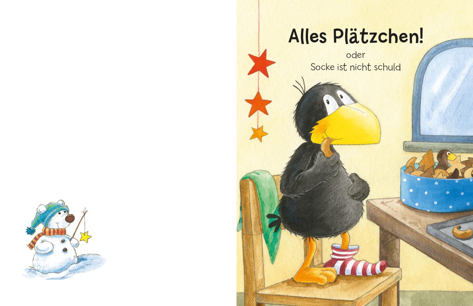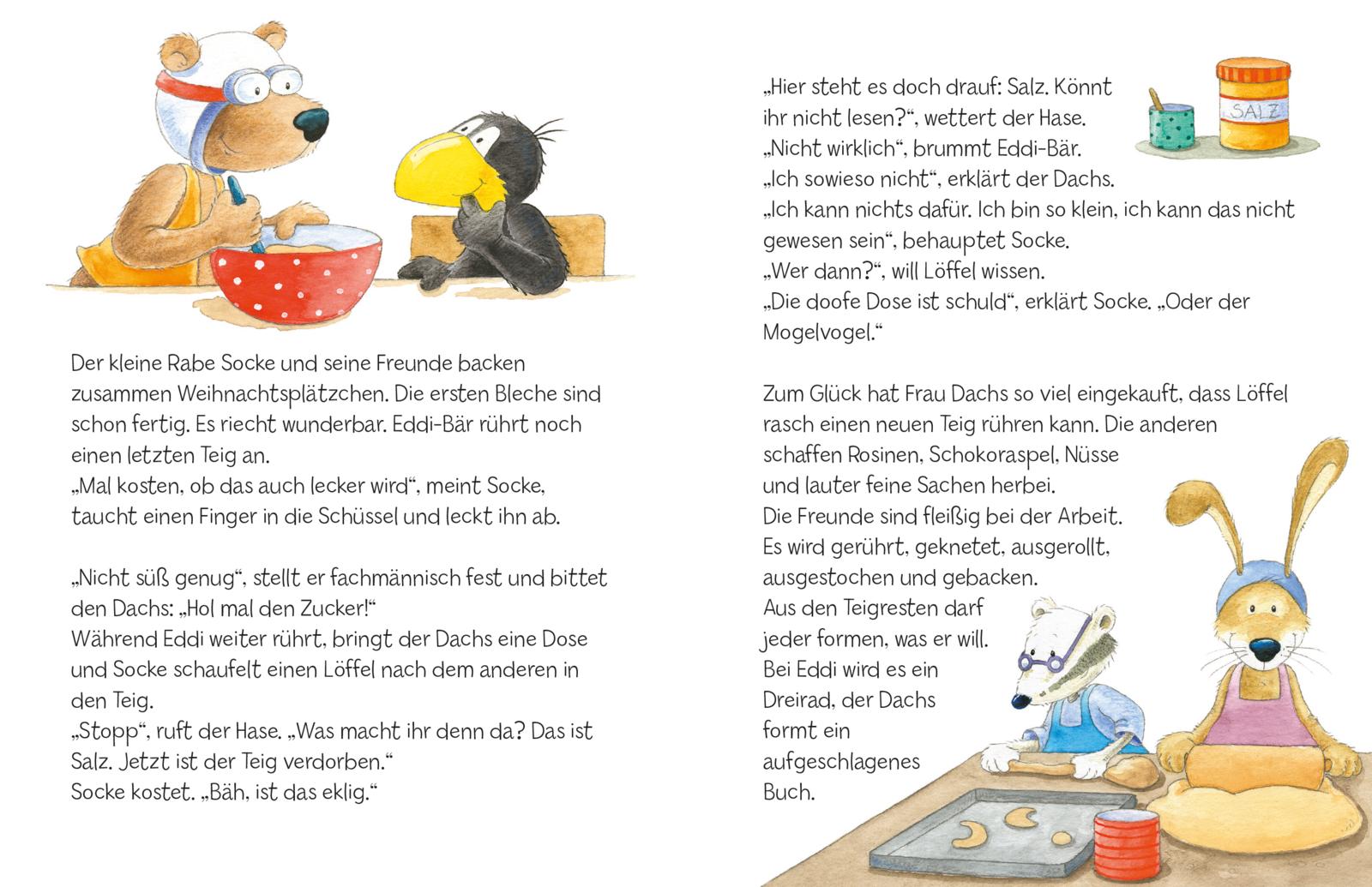 Bald ist Weihnachten und der kleine Rabe Socke bereitet sich eifrigst darauf vor: Erst backt er mit seinen Freunden versehentlich die leckersten Plätzchen, dann hält er ein bisschen die Zeit an, weil es gerade so gemütlich ist, und am Ende rettet er doch wirklich das ganze Weihnachtsfest.