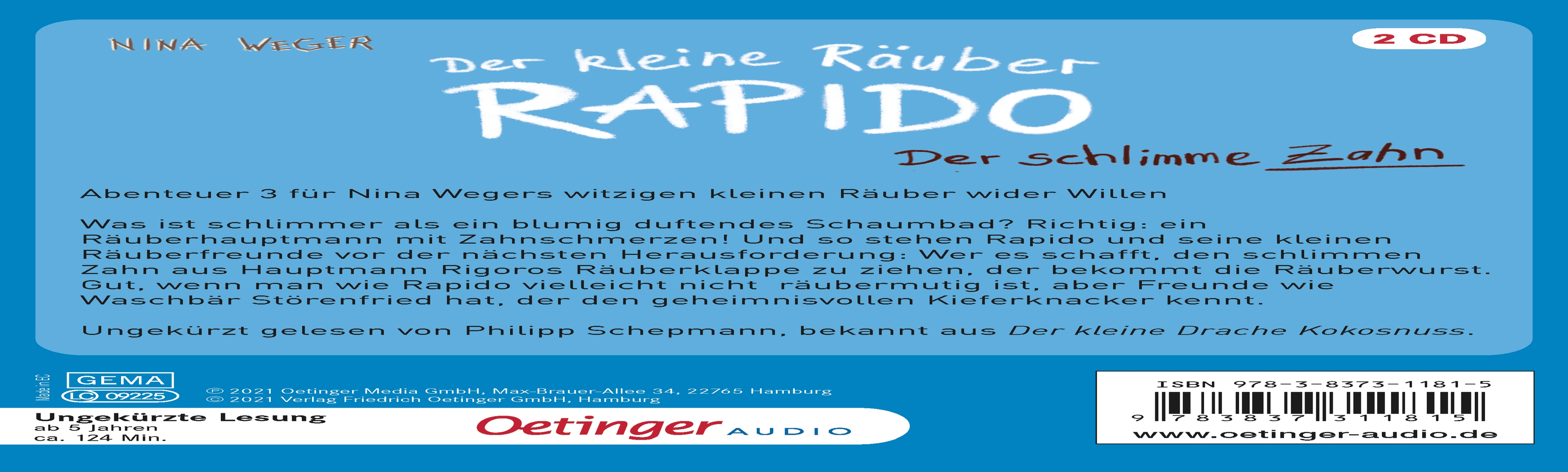 Abenteuer 3 für Nina Wegers witzigen kleinen Räuber wider Willen. Was ist schlimmer als ein blumig duftendes Schaumbad? Richtig: ein Räuberhauptmann mit Zahnschmerzen! Und so stehen Rapido und seine kleinen Räuberfreunde vor der nächsten Herausforderung: Wer es schafft, den schlimmen Zahn aus Hauptmann Rigoros Räuberklappe zu ziehen, der bekommt die Räuberwurst. Gut, wenn man wie Rapido vielleicht nicht räubermutig ist, aber Freunde wie Waschbär Störenfried hat, der den geheimnisvollen Kieferknacker kennt.