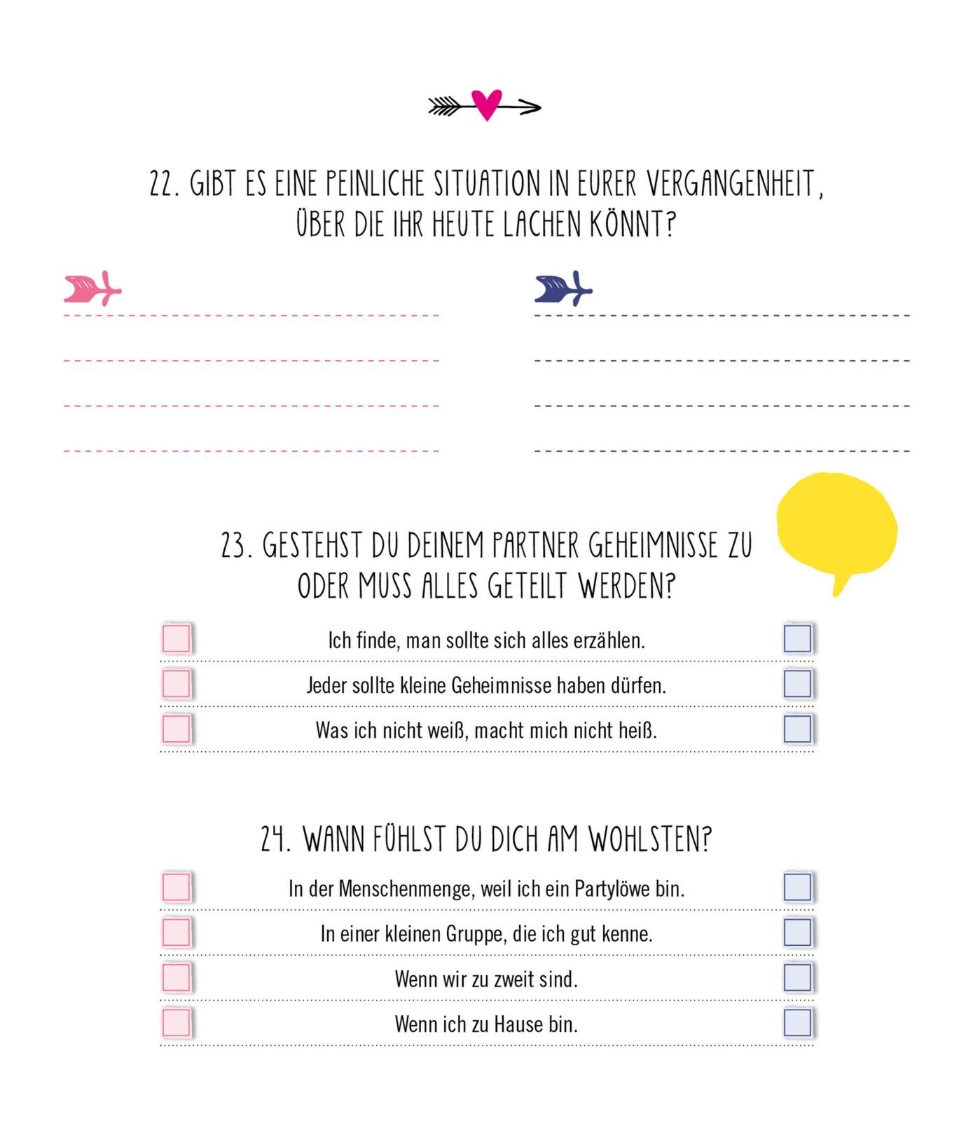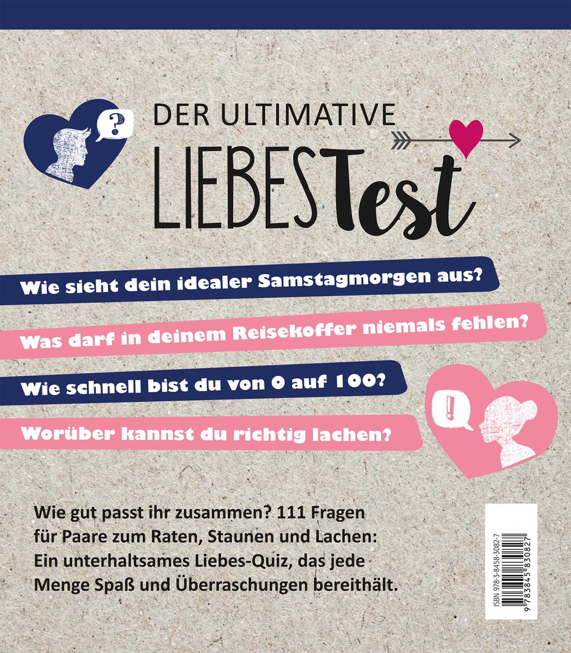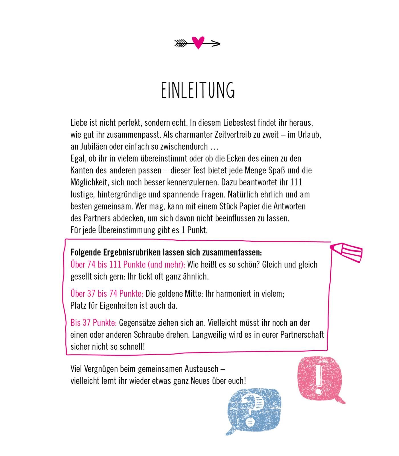 Liebe muss nicht perfekt sein, sondern echt. In diesem Liebes-Test findet ihr heraus, wie gut ihr zusammenpasst. Egal ob ihr in vielem übereinstimmt oder ob die Ecken des einen zu den Kanten des anderen passen – dieser Test bietet jede Menge Spaß und die Möglichkeit, sich noch besser kennenzulernen. 111 lustige, hintergründige und spannende Fragen laden zum Raten, Staunen und Lachen ein. Als charmanter Zeitvertreib zu zweit – im Urlaub, an Jubiläen oder einfach so zwischendurch.