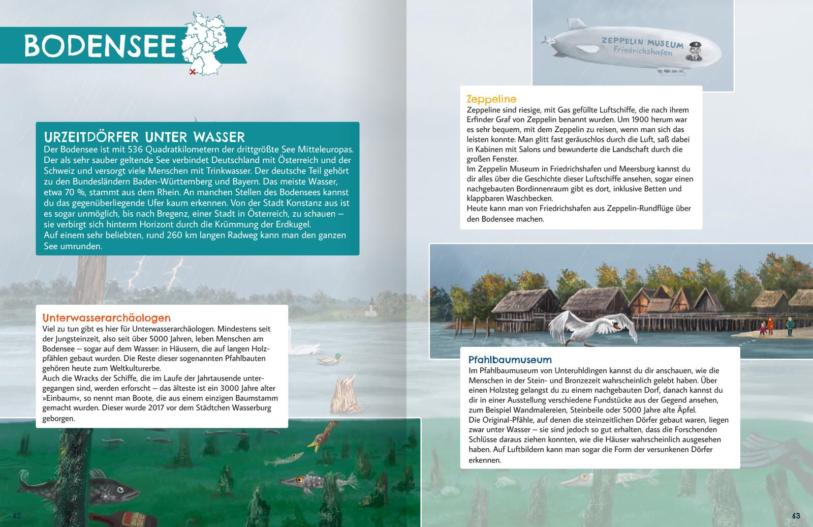 Deutschland ist ein Land der Vielfalt – sowohl hinsichtlich der Landschaften, der Geschichte und Kultur, der Städte als auch der Menschen. Dieses großartig illustrierte Buch nimmt uns mit auf eine Entdeckungsreise von Nord nach Süd, vom Meer zu den Bergen und vom Frühling in den Winter. Von der Berliner Mauer, dem Hamburger Hafen, der Altstadt von Quedlinburg über die Saarschleife bis zum Ruhrgebiet und zum Bayerischen Wald werden die verschiedensten Regionen vorgestellt und in großformatigen Illustrationen gezeigt, die die Leser und Leserinnen in die Szenen und in ihren Bann ziehen. Die kurzen Texte erzählen spannende und überraschende Fakten, die für Erwachsene ebenfalls interessant sind.