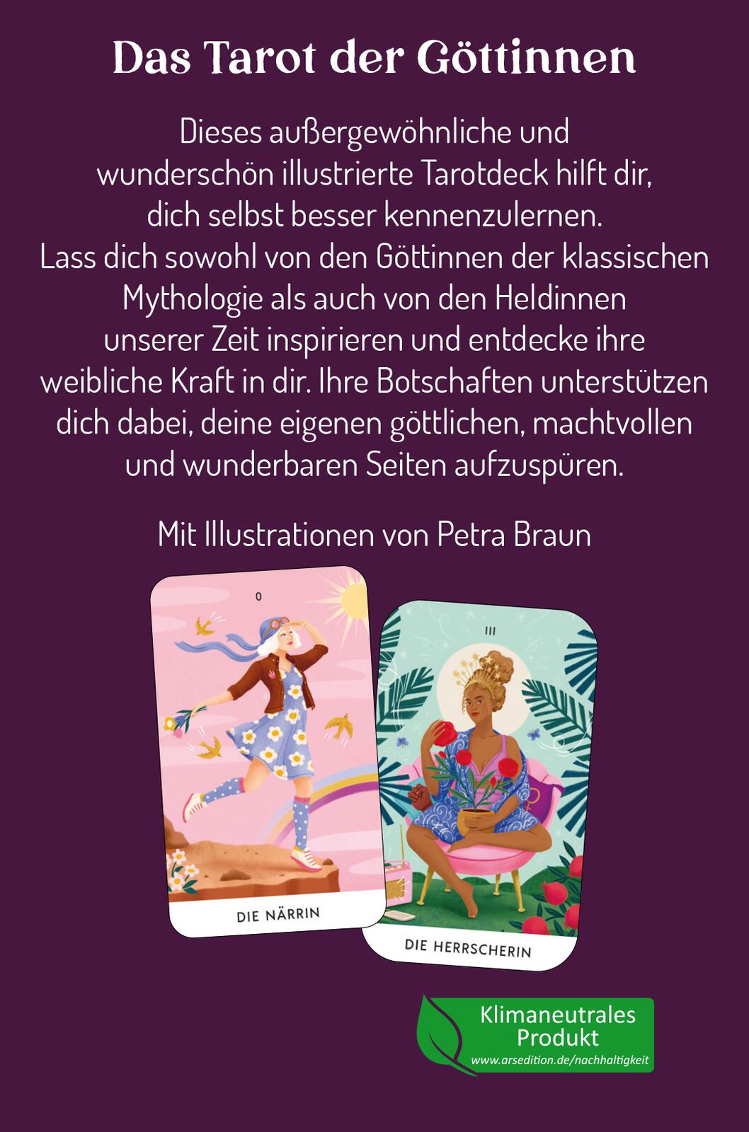 Dieses von der Künstlerin Petra Braun wunderschön illustrierte Tarot hilft dir, dich selbst besser kennenzulernen und zu verstehen. Das Besondere daran: Jede Große Arkana des Decks wird mit einer klassischen Göttin assoziiert, der jeweils eine zeitgenössische Frauenfigur zur Seite gestellt ist. So kannst du dich sowohl von den Göttinnen der klassischen Mythologie als auch den modernen Heldinnen unserer Zeit inspirieren lassen, ihre weibliche Kraft in dir entdecken und die Botschaften, die sie dir vermitteln, auf dein tägliches Leben anwenden.