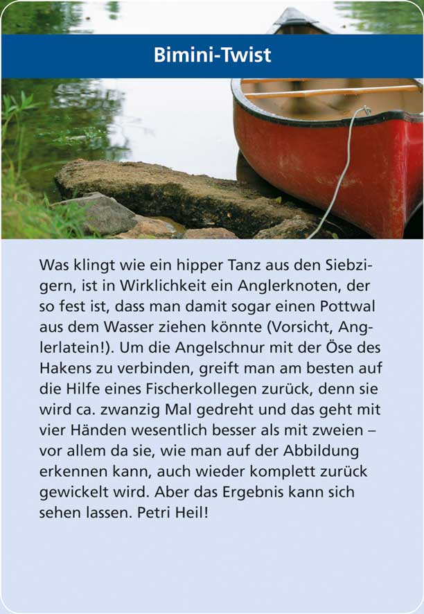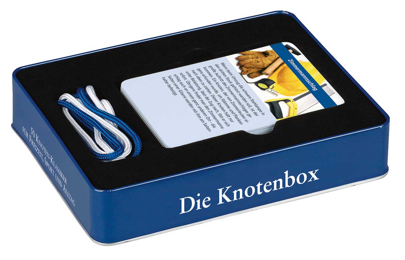 50 bewährte und praktische Knoten auf 50 handlichen Karten plus zwei Knotenschnüre. Mit zahlreichen anschaulichen Schritt-für-Schritt Abbildungen. In einer hochwertigen Geschenkbox aus Metall.