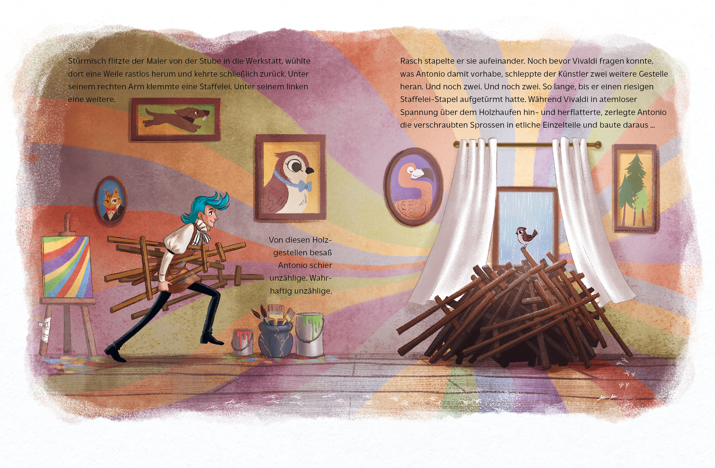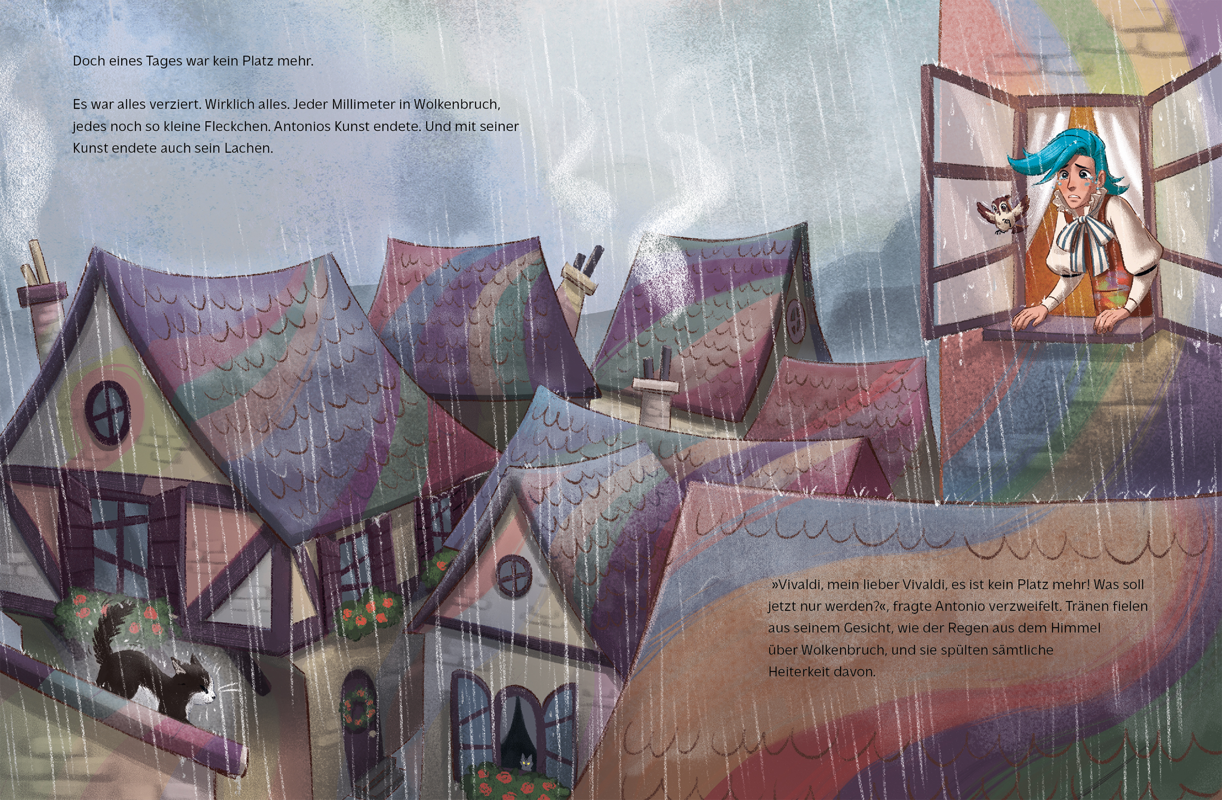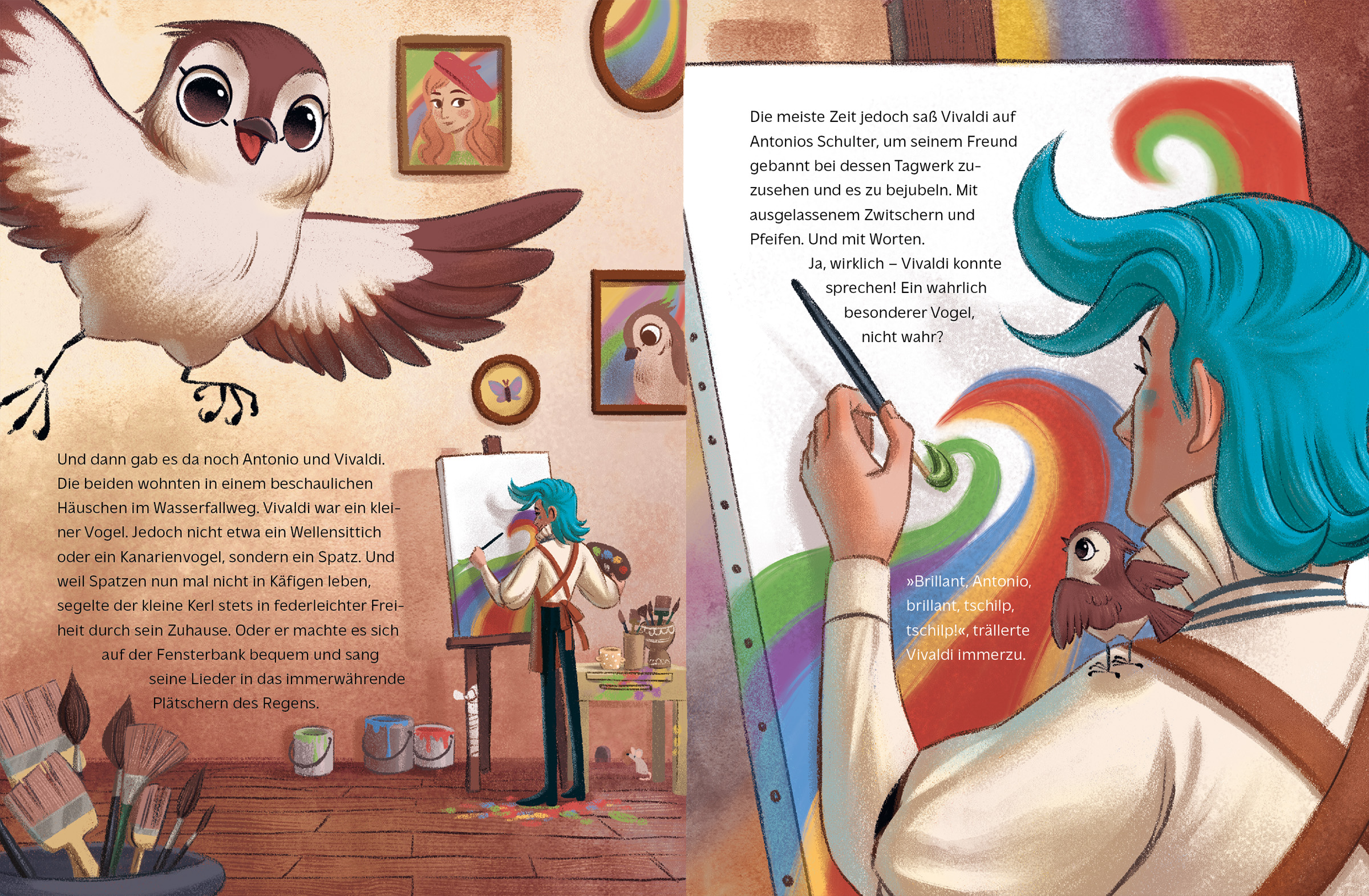 Der Maler Antonio lebt mit seinem tierischen Freund, dem Spatz Vivaldi, in Wolkenbruch. Dort regnet es tagein, tagaus. Eines Tages findet Antonio keinen Platz mehr für seine Kunst. Da kommt den beiden die Idee, den grauen Himmel wie eine Leinwand zu nutzen. Antonio steigt mutig hinauf in den Himmel und malt mit Wasserfarben einen riesigen Regenbogen. Und der lockt dann auch endlich die Sonne nach Wolkenbruch! Ein Buch für Kinder ab 3 Jahren über die Kraft der Freundschaft und der Zuversicht.