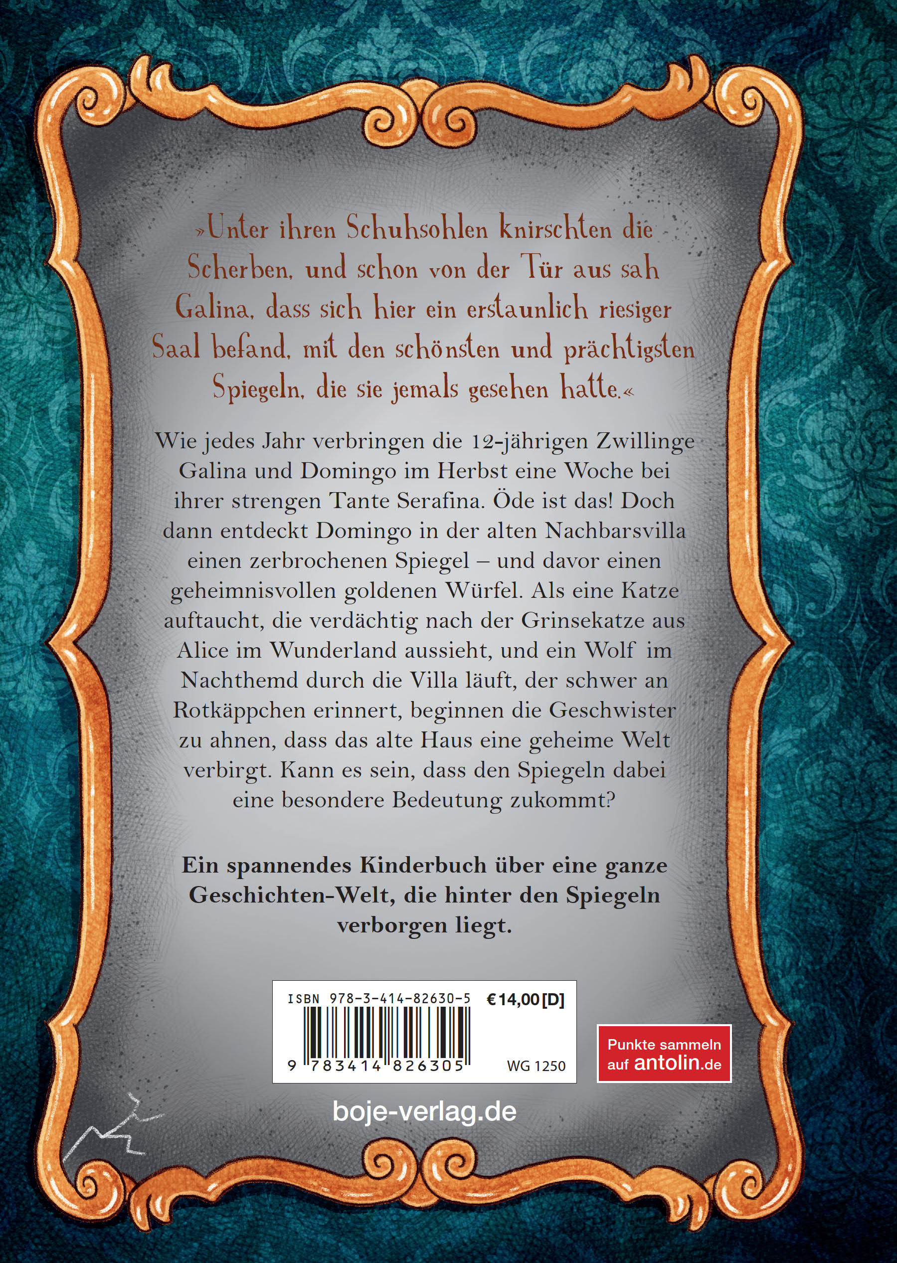 - Beschreibung »Unter ihren Schuhsohlen knirschten die Scherben, und schon von der Tür aus sah Galina, dass sich hier ein erstaunlich riesiger Saal befand, mit den schönsten und prächtigsten Spiegeln, die sie jemals gesehen hatte.« Wie jedes Jahr verbringen die 12-jährigen Zwillinge Galina und Domingo im Herbst eine Woche bei ihrer strengen Tante Serafina. Öde ist das! Doch dann entdeckt Domingo in der alten Nachbarsvilla einen zerbrochenen Spiegel - und davor einen geheimnisvollen goldenen Würfel. Als eine Katze auftaucht, die verdächtig nach der Grinsekatze aus Alice im Wunderland aussieht und ein Wolf im Nachthemd durch die Villa läuft, der schwer an Rotkäppchen erinnert, beginnen die Geschwister zu ahnen, dass das alte Haus eine geheime Welt verbirgt. Kann es sein, dass den Spiegeln dabei eine besondere Bedeutung zukommt?Ein spannendes Kinderbuch über eine ganze Geschichten-Welt, die hinter den Spiegeln verborgen liegt.