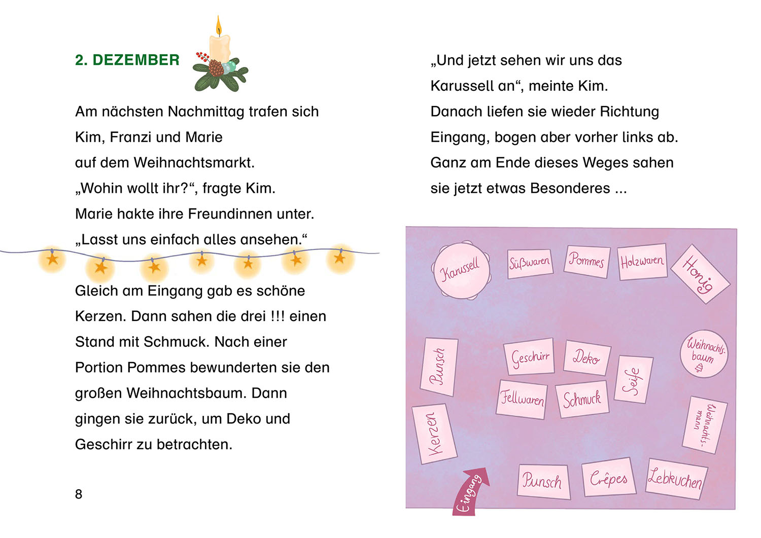 - Beschreibung Ein tolles Geschenk für Die drei !!!-Fans im Grundschulalter: Jetzt gibt es einen Detektiv-Adventskalender speziell für Leseanfängerinnen und Leseanfänger ab der 2. Klasse. Jeden Tag selbstständig ein spannendes Kapitel lesen und ein weihnachtliches Rätsel oder eine Aufgabe lösen. Ob die Antwort richtig ist? Die Lösungen sind in den verschlossenen Seiten verborgen. Als Extra ist ein schönes Weihnachtsposter enthalten. So vergeht die Adventszeit wie im Flug. Kim, Franzi und Marie sind „Die drei !!!“. Mutig und clever ermitteln die drei Freundinnen und sind jedem Fall gewachsen.