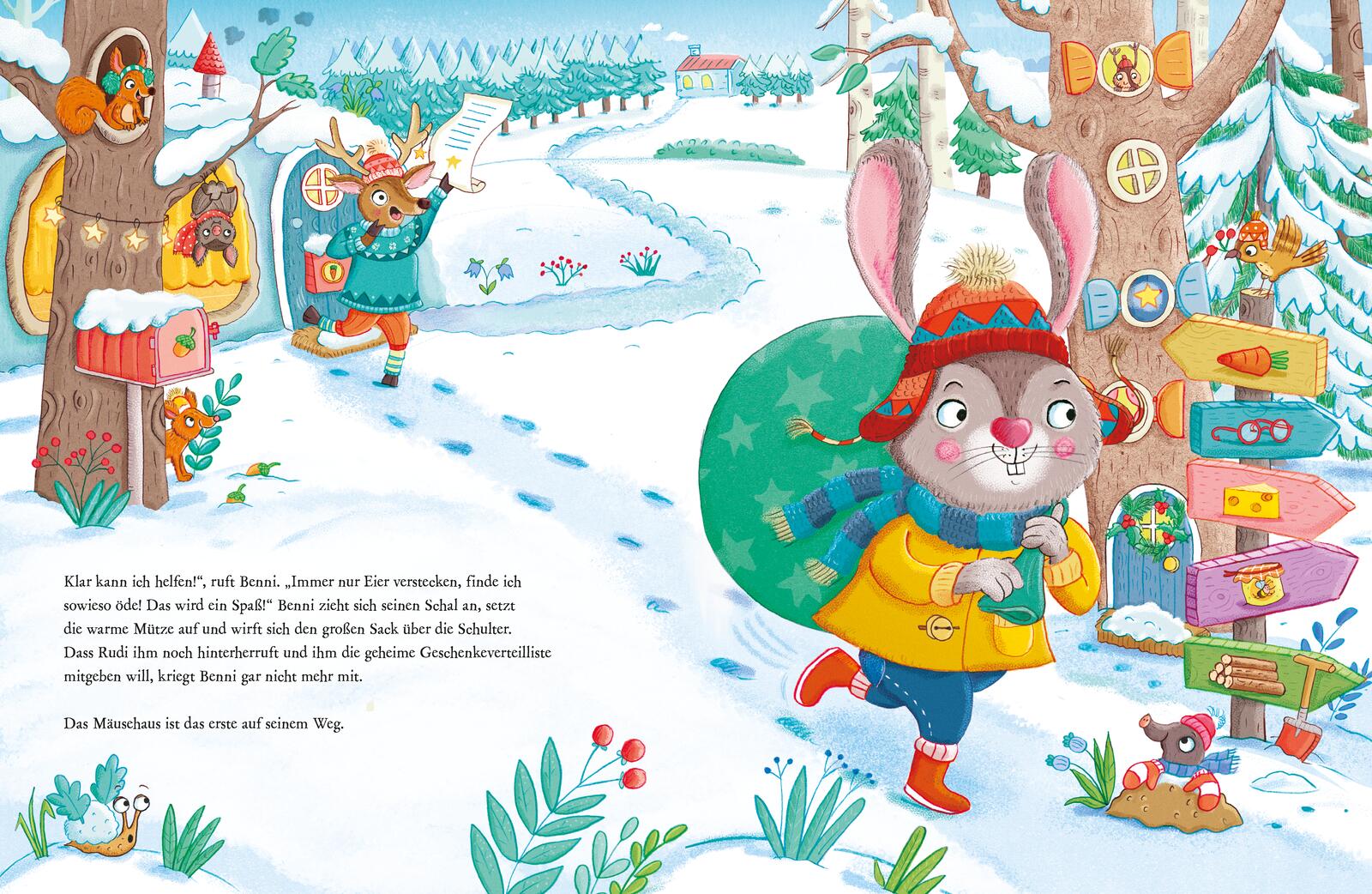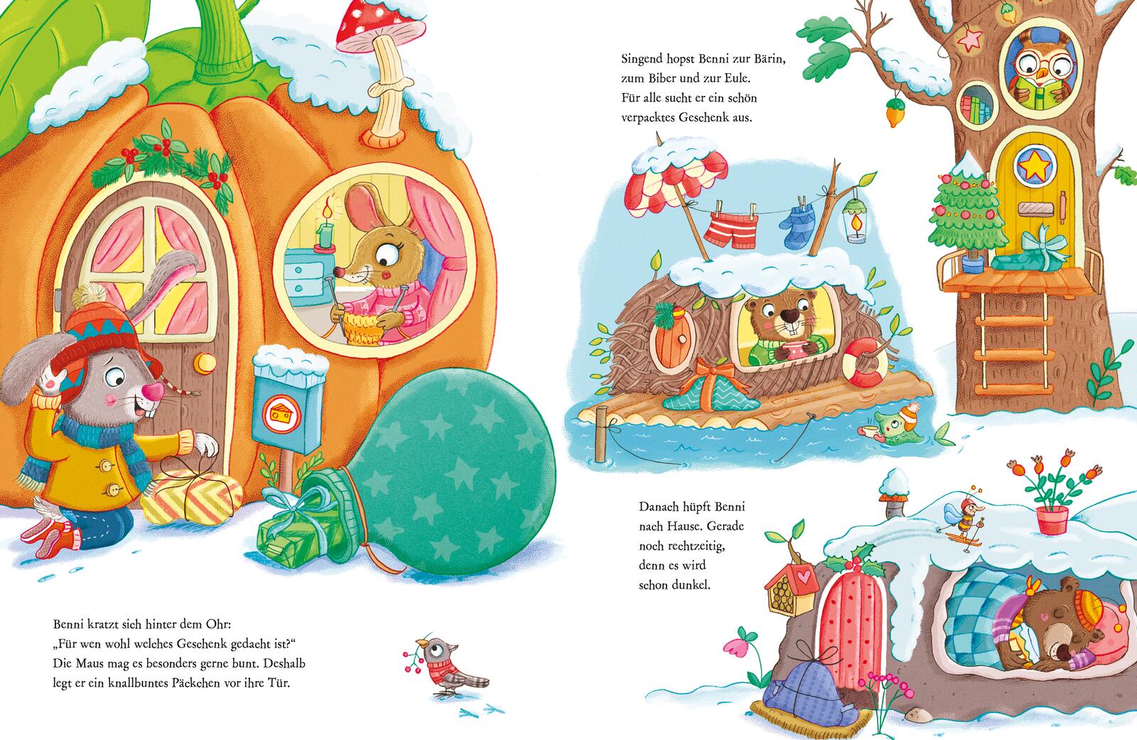 Oh Schreck, der Weihnachtsmann hat Schnupfen! Wer verteilt jetzt bloß die Geschenke an die Waldtiere? Zum Glück springt Hase Benni ein. Weil er vergisst, zu fragen, welches Päckchen für wen gedacht ist, bekommt kein Tier das, was es erwartet hat – sondern etwas viel Besseres: Dinge, von denen sie gar nicht wussten, dass sie sie gebrauchen können. Und dazu das kribbelig-schöne Gefühl einer gelungenen Überraschung. Schließlich geht es beim Weihnachtsfest darum, liebevoll bedacht zu werden und gemeinsam ein schönes Fest zu feiern. Und der Weihnachtsmann? Der ist glücklich und zufrieden – und sein Schnupfen ist auch bald wieder auskuriert.