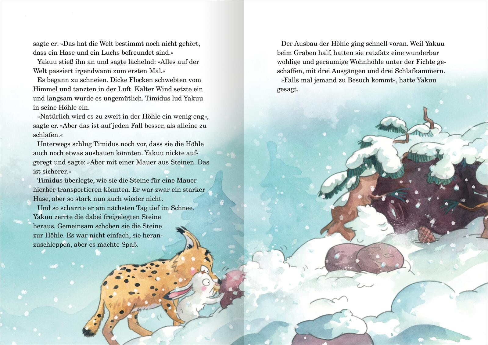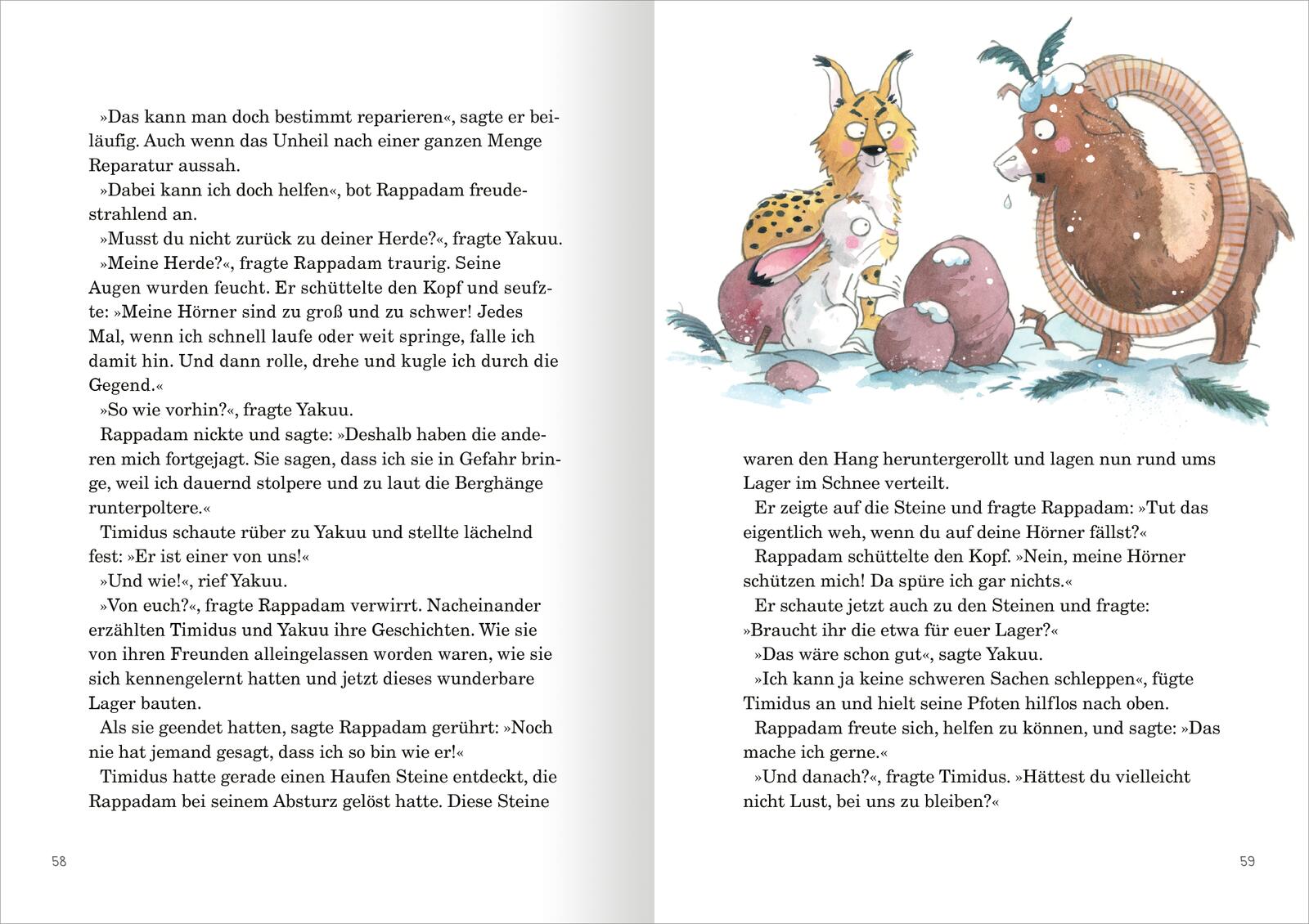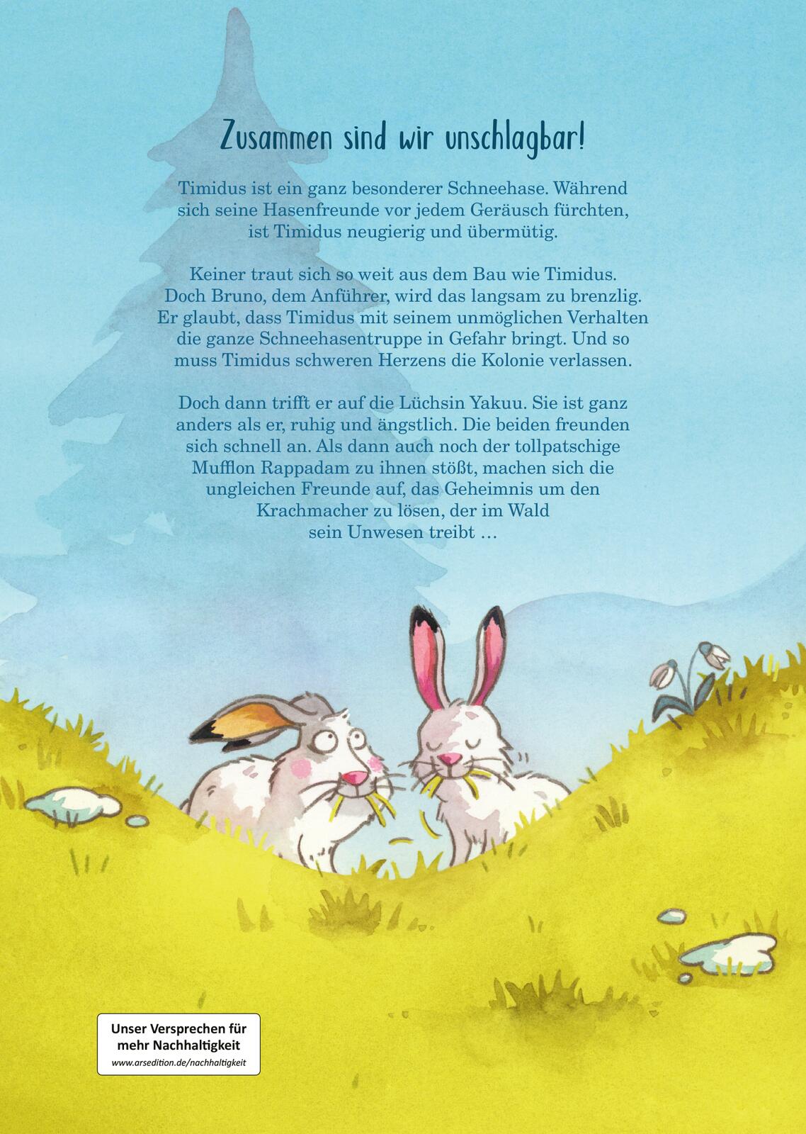 Anfangs macht ihm das auch noch viel Spaß. Timidus kann endlich selbst entscheiden, wie er leben möchte, und muss auf niemanden hören. Doch dann wird es recht schnell ziemlich einsam in seinem neu errichteten Bau. Gut, dass er auf die Lüchsin Yakuu trifft. Sie ist ganz anders als er. Ruhig und sehr vorsichtig, ja vielleicht sogar ein bisschen ängstlich. Also, keine Gefahr für Timidus. Die beiden freunden sich schnell an. Als dann auch noch der tollpatschige Mufflon Rappadam zu ihnen stößt, machen sich die ungleichen Freunde bereit, das Geheimnis um den Krachmacher zu lösen, der im Wald sein Unwesen treibt …