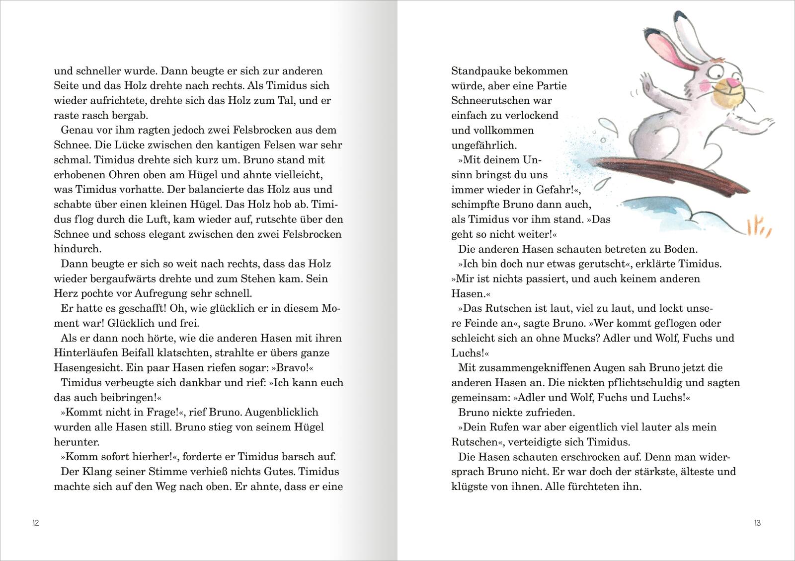 Timidus ist ein ganz besonderer Schneehase. Während sich seine Hasenfreunde in der Kolonie vor jedem kleinen Geräusch fürchten und sich schnell verstecken, wenn etwas Ungewöhnliches vor sich geht, ist Timidus neugierig und übermütig. Keiner kann so schnell Schneebrett fahren wie er. Keiner traut sich so weit aus dem Bau wie Timidus. Doch Bruno, dem Anführer der Kolonie, wird das langsam zu brenzlig. Er glaubt, dass Timidus mit seinem unmöglichen Verhalten die ganze Schneehasentruppe in Gefahr bringt. Und so muss Timidus schweren Herzens die Kolonie verlassen und allein leben.