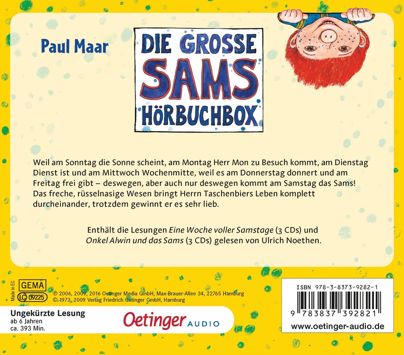 - Beschreibung "Die große Sams-Hörbuchbox" bringt Kindern die abenteuerlichen Erzählungen von Paul Maar in zwei fesselnden Geschichten näher, in denen ein ungewöhnliches Wesen namens Sams das Leben des ängstlichen Herrn Taschenbier gehörig auf den Kopf stellt. Dieses respektlose Wesen, das zufällig Herrn Taschenbier begegnet, kann Wünsche erfüllen und erklärt ihn kurzerhand zu seinem Papa. Die beiden Geschichten „Eine Woche voller Samstage“ und „Onkel Alwin und das Sams“, meisterhaft gelesen von Ulrich Noethen, bieten eine humorvolle und spannende Unterhaltung, die Kinder in die Welt der Fantasie entführt. Im Laufe der Erzählungen gewinnt Herr Taschenbier das Sams, das anfangs für Peinlichkeiten sorgt, immer mehr lieb und entdeckt die Vorteile, die ein solches magisches Wesen mit sich bringt, insbesondere wenn es darum geht, den lästigen Onkel Alwin loszuwerden, der sich ungebeten in der Familie breitmacht. Begeisterndes Hörerlebnis: Ulrich Noethen bringt durch seine Lesung die Charaktere zum Leben und verleiht jeder Situation Tiefe und Humor. Zwei Geschichten in einer Box: Die Box enthält zwei vollständige Abenteuer, die Kinder stundenlang unterhalten und fesseln werden. Förderung der Fantasie: Die originellen und fantasievollen Geschichten fördern die Kreativität und die Vorstellungskraft junger Zuhörer. Ideales Geschenk für junge Leser*innen: Perfekt für Kinder ab 6 Jahren, die spannende Geschichten mit einer Prise Humor lieben. Langlebige Unterhaltung: Die Hörbuchbox bietet langanhaltenden Hörgenuss und kann immer wieder angehört werden, ideal für lange Autofahrten oder entspannte Nachmittage.