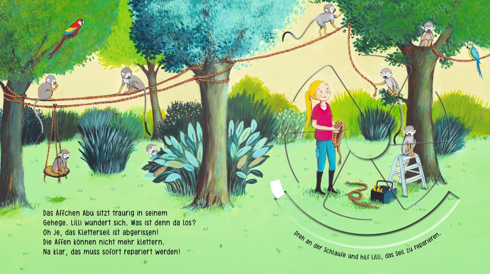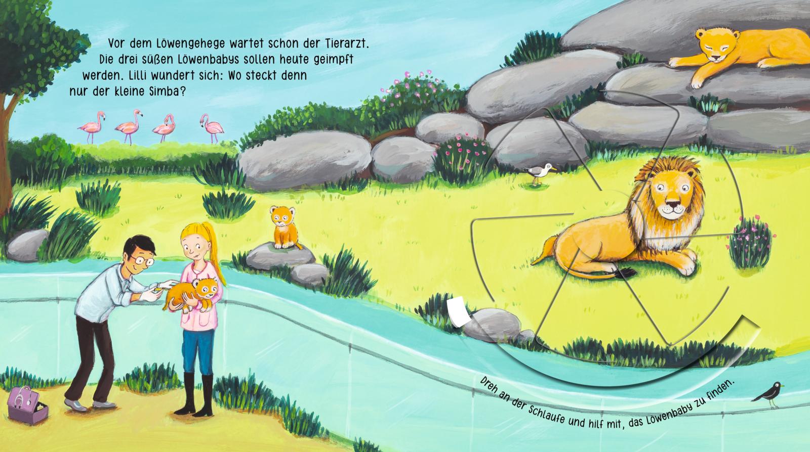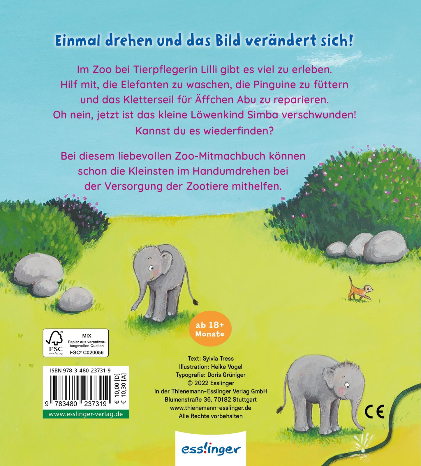 Bei diesem interaktiven Mitmachbuch können schon die Allerkleinsten ab 18 Monaten beim Versorgen der Zootiere mithelfen: die Elefanten waschen, das Kletterseil für die Äffchen reparieren, die hungrigen Pinguine fürttern und das verschwundene Löwenbabay Simba wiederfinden.