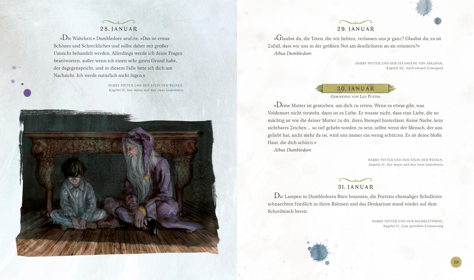Ein magisches Jahr mit Harry Potter nimmt die Leser*innen mit auf eine zauberhafte Reise durch die Jahreszeiten. Jim Kays bildgewaltige Illustrationen, zusammen mit den berühmten Zitaten aus J.K. Rowlings heiß geliebten Romanen, erwecken die magische Welt schillernd zum Leben. Jeder Tag steht im Zeichen eines anderen Jubiläums oder einer wichtigen Erinnerung aus den Harry-Potter-Romanen.