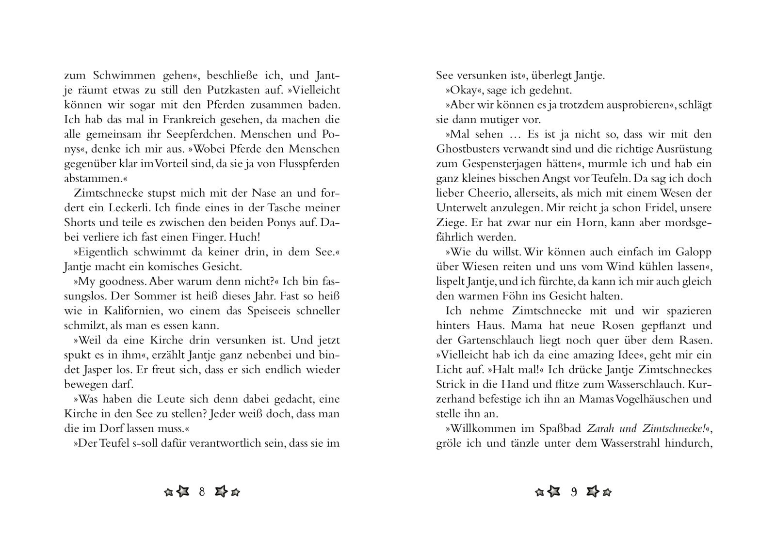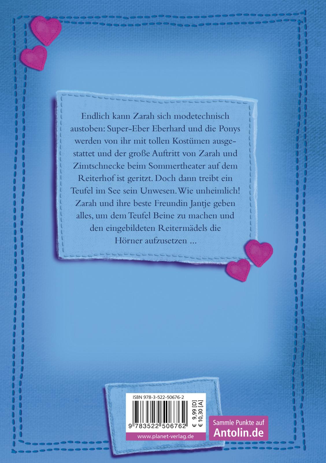 Der Traum aller Pferde-Mädchen: Sommerferien auf dem Reiterhof mit Pferde-Theater. Endlich kann Zarah sich modetechnisch austoben: Supereber Eberhard und die Ponys werden von ihr mit tollen Kostümen ausgestattet und der große Auftritt von Zarah und Zimtschnecke beim Sommertheater ist geritzt. Doch dann treibt ein Teufel im See sein Unwesen. Wie unheimlich! Zarah und Jantje geben alles, um dem Teufel Beine zu machen und den eingebildeten Reitermädchen die Hörner aufzusetzen ...