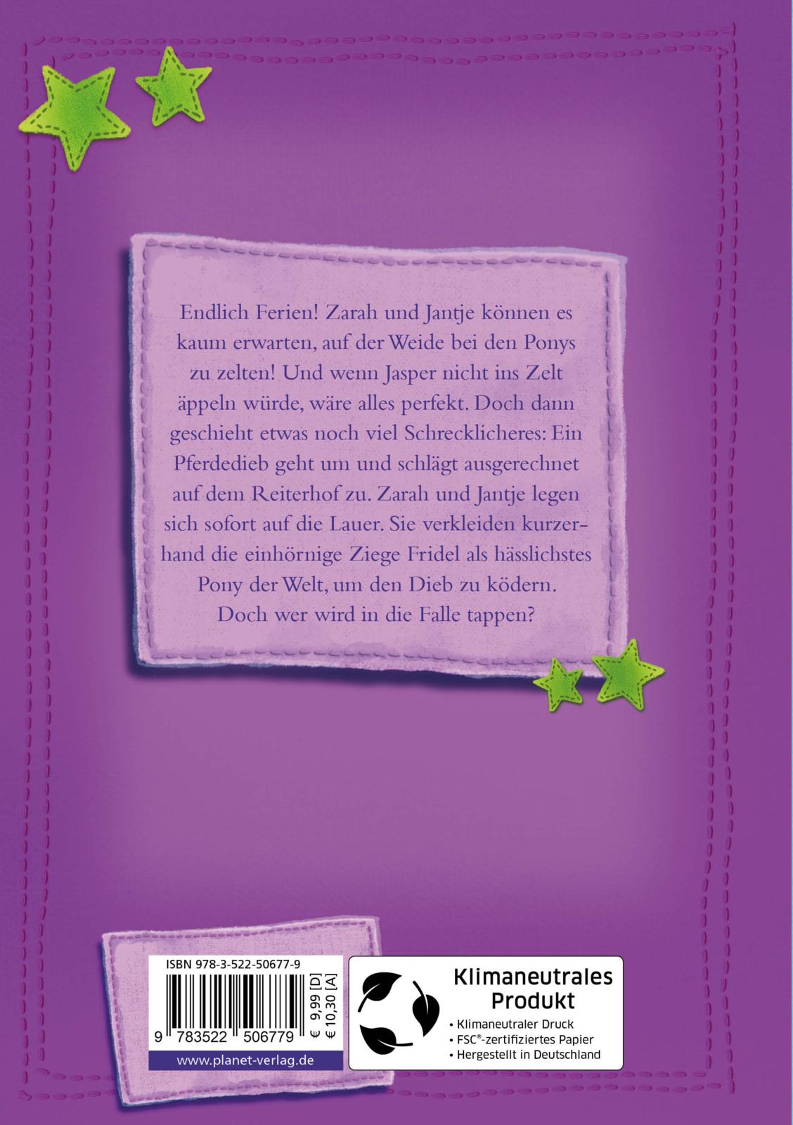 Endlich Ferien! Zarah und Jantje können es kaum erwarten, auf der Weide bei den Ponys zu zelten! Und wenn Jasper nicht ins Zelt äppeln würde, wäre alles perfekt. Doch dann geschieht etwas noch viel Schrecklicheres: Ein Pferdedieb geht um und schlägt ausgerechnet auf dem Reiterhof zu. Zarah und Jantje legen sich sofort auf die Lauer. Sie verkleiden kurzerhand die einhörnige Ziege Fridel als hässlichstes Pony der Welt, um den Dieb zu ködern. Doch wer wird in die Falle tappen? Vielleicht der kurzsichtige Pleitegeier Reinhold oder die plötzlich total reiche Ulrike oder doch ein kopfloser Reiter ...