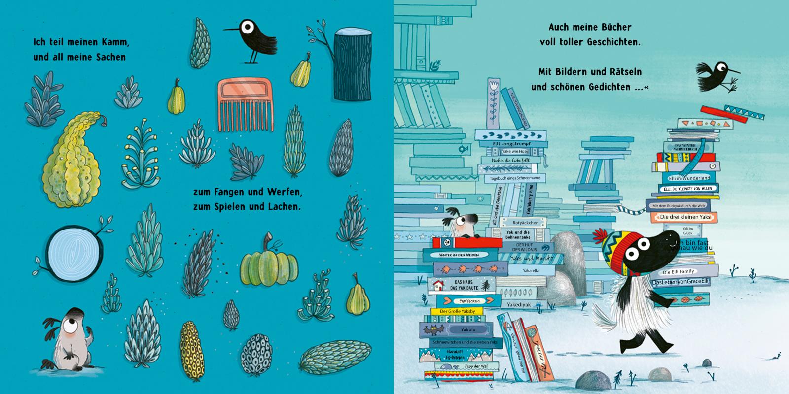 Was für eine Nachricht für die Kleinste von allen! Elli bekommt ein Geschwisterchen. Begeistert malt sie ein Willkommensschild und strickt Lätzchen. Auch ihre Hufwärmer und Bücher will Elli gerne teilen. Doch Moment – muss sie eigentlich auch Mama teilen? Gibt es in Mamas Herz überhaupt genug Platz für zwei Yaks? Mamas Antwort ist so schön, dass sich Elli noch mehr darauf freut, große Schwester zu werden.