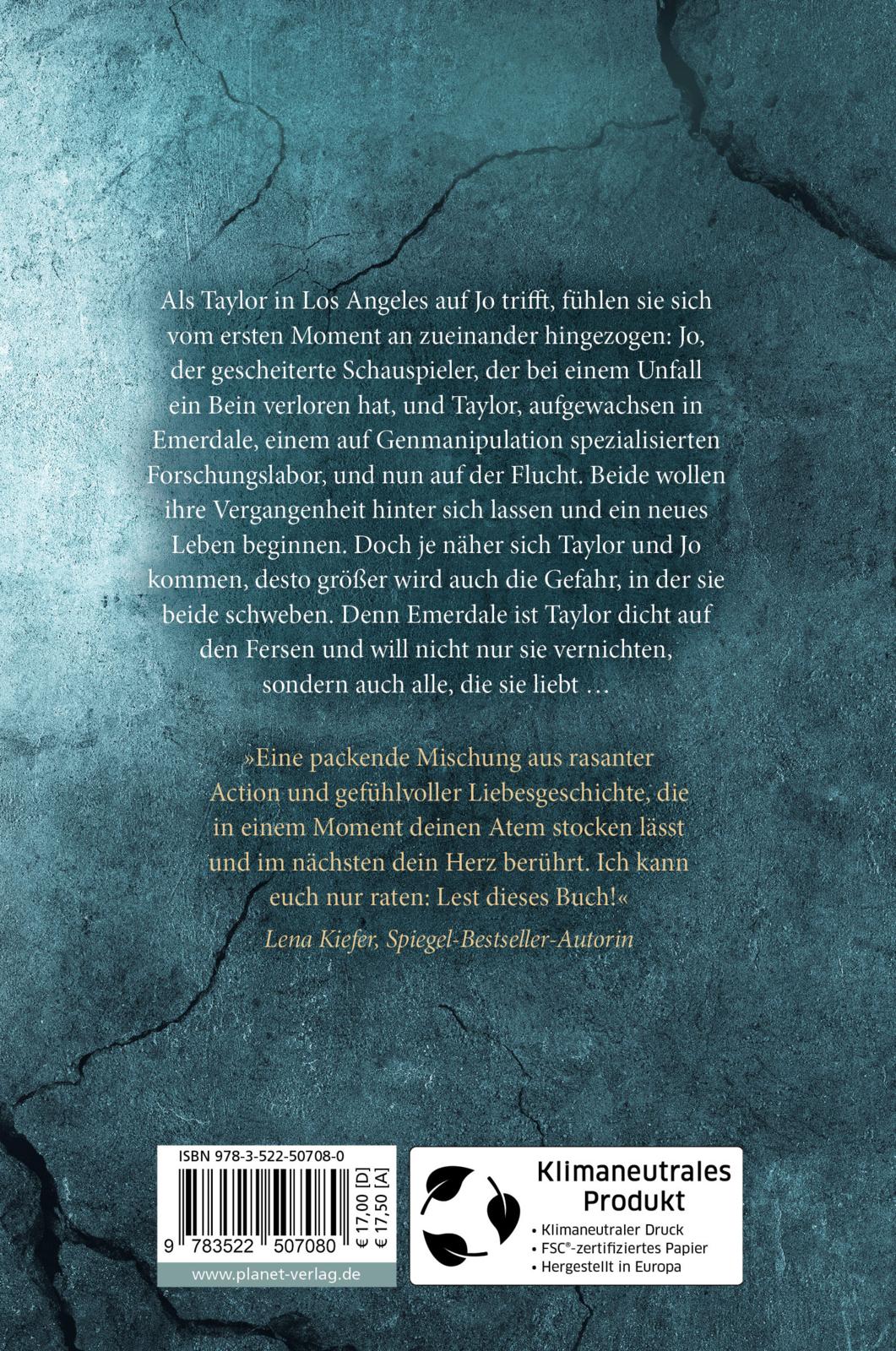 Als Taylor in Los Angeles auf Jo trifft, fühlen sie sich vom ersten Moment an zueinander hingezogen: Jo, der gescheiterte Schauspieler, der bei einem Unfall ein Bein verloren hat, und Taylor, aufgewachsen in Emerdale, einem auf Genmanipulation spezialisierten Forschungslabor, und nun auf der Flucht. Beide wollen ihre Vergangenheit hinter sich lassen und ein neues Leben beginnen. Doch je näher sich Taylor und Jo kommen, desto größer wird auch die Gefahr, in der sie beide schweben. Denn Emerdale ist Taylor dicht auf den Fersen und will nicht nur sie vernichten, sondern auch alle, die sie liebt …