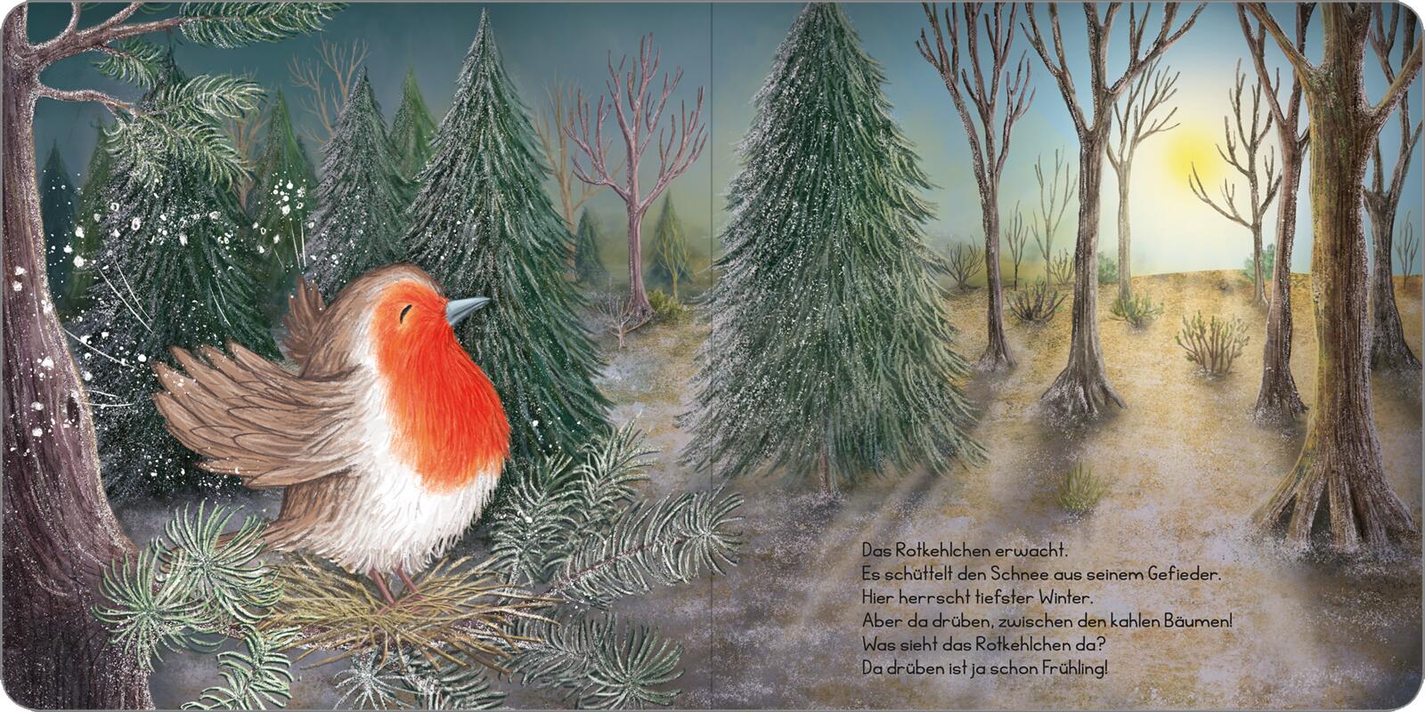 Der kalte Winter neigt sich dem Ende zu, als das Rotkehlchen erwacht und drüben, zwischen den kahlen Bäumen, auf der Lichtung im Wald den Frühling entdeckt. "Es fliegt durch warme Sonnenstrahlen und kann kaum glauben, dass unter ihm die Blumen blühen. Aber sie sind da!"