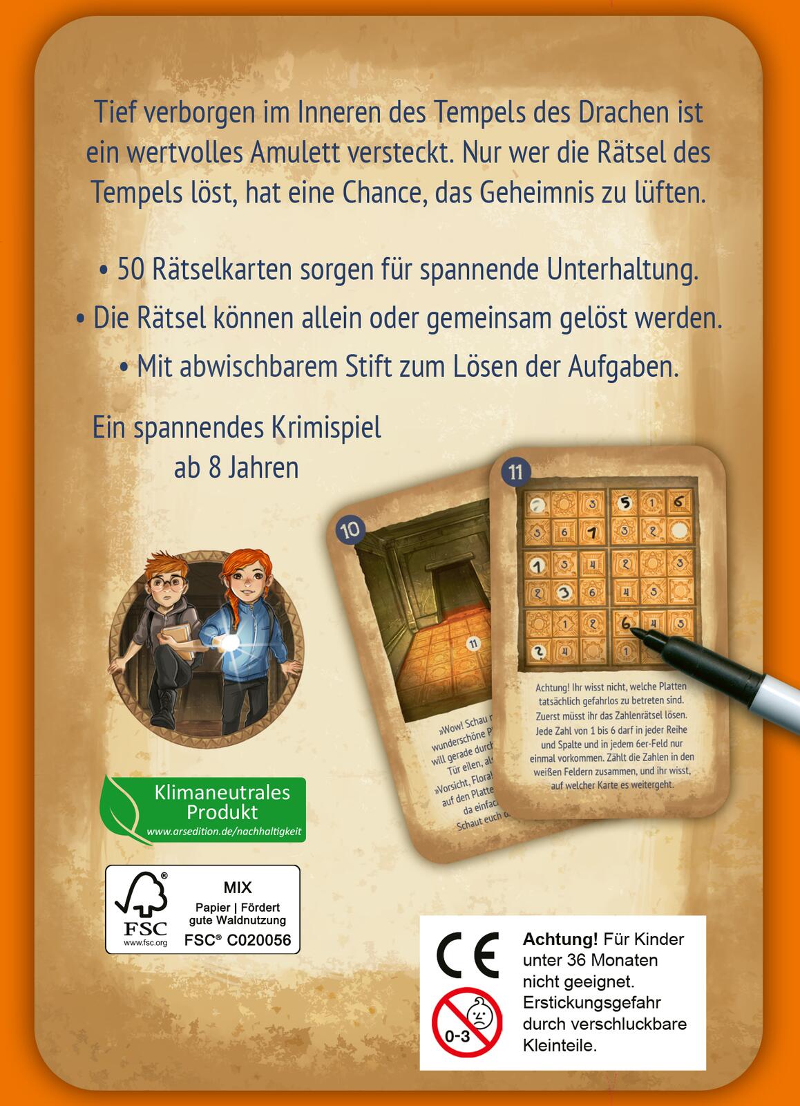 - Beschreibung Wer traut sich, die erste Karte umzudrehen? Tief verborgen im Inneren des Tempels des Drachen ist ein wertvolles Amulett versteckt, es zu finden und allen Gefahren zu trotzen, wird nicht einfach werden! Nur wer die Rätsel des Tempels löst, hat eine Chance, dieses Abenteuer zu bestehen.Fesselndes Exit-Kartenspiel: 50 Rätselkarten sorgen für spannende UnterhaltungSpielspaß für die ganze Familie: Die abwechslungsreichen Rätsel können allein oder gemeinsam gelöst werdenIm handlichen Format: Aufgrund der praktischen Kartenbox ist dieses spannende Escape-Game überall spielbar – ob daheim oder im UrlaubMit abwischbarem Stift: Dank des beigelegten Stifts sind die Aufgaben mehrfach lösbar und Fehler werden einfach weggewischtIdeales Geschenk: Das abwechslungsreiche Kartenspiel ist ein perfektes Geschenk für Familien und Spielefans ab 8 JahrenSpannendes Escape-Krimi-SpielSchritt für Schritt, Rätsel für Rätsel kommt man der Lösung näher und erlebt ein circa 75-minütiges Abenteuer im südamerikanischen Dschungel.