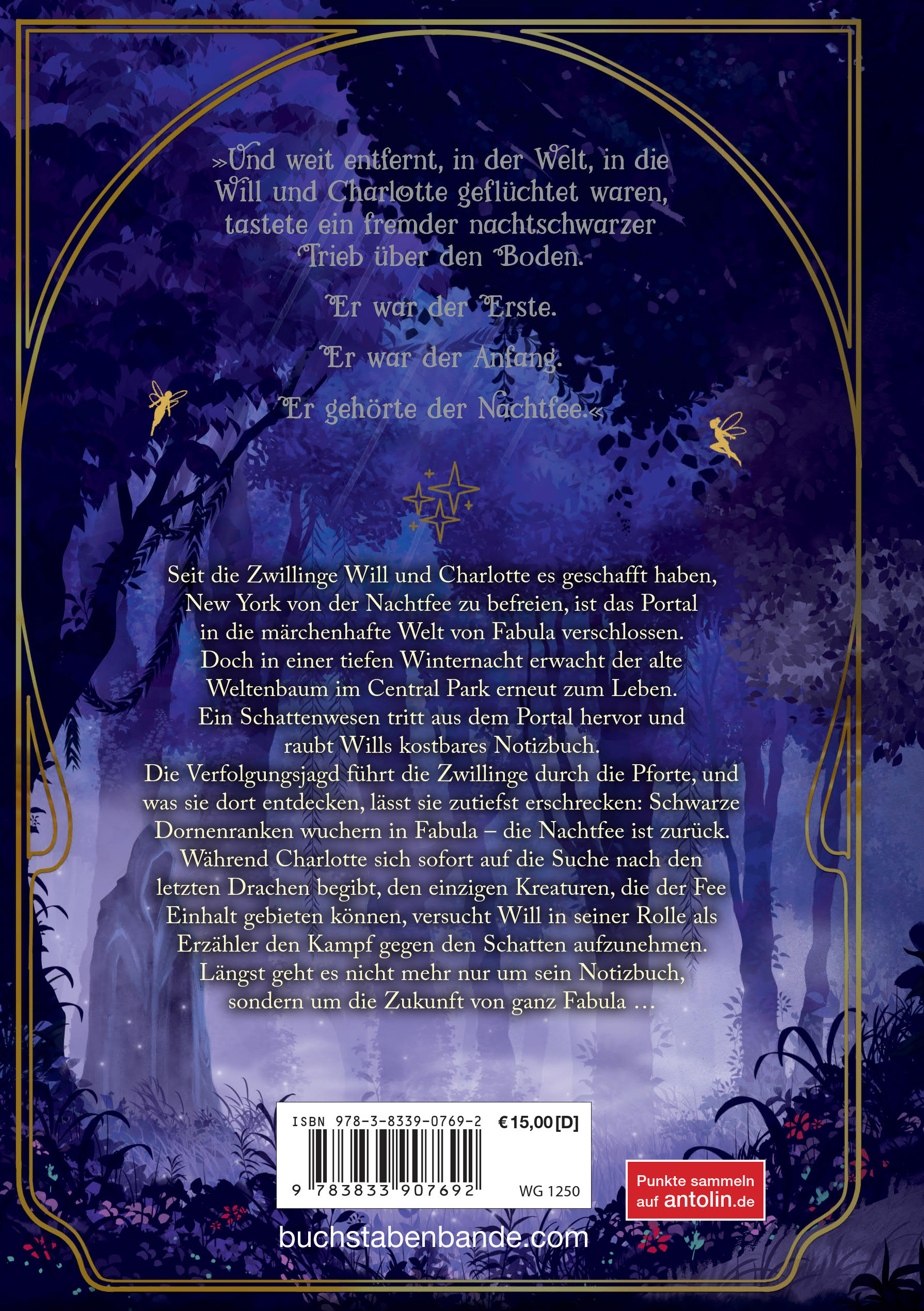Seit die Zwillinge Will und Charlotte es geschafft haben, New York von der Nachtfee zu befreien, ist das Portal in die märchenhafte Welt von Fabula verschlossen. Doch in einer tiefen Winternacht erwacht der alte Weltenbaum im Central Park erneut zum Leben. Ein Schattenwesen tritt aus dem Portal hervor und raubt Wills kostbares Notizbuch. Die Verfolgungsjagd führt die Zwillinge durch die Pforte, und was sie dort entdecken, lässt sie zutiefst erschrecken: Schwarze Dornenranken wuchern in Fabula - die Nachtfee ist zurück. Während Charlotte sich sofort auf die Suche nach den letzten Drachen begibt, den einzigen Kreaturen, die der Fee Einhalt gebieten können, versucht Will in seiner Rolle als Erzähler den Kampf gegen den Schatten aufzunehmen. Längst geht es nicht mehr nur um sein Notizbuch, sondern um die Zukunft von ganz Fabula ...