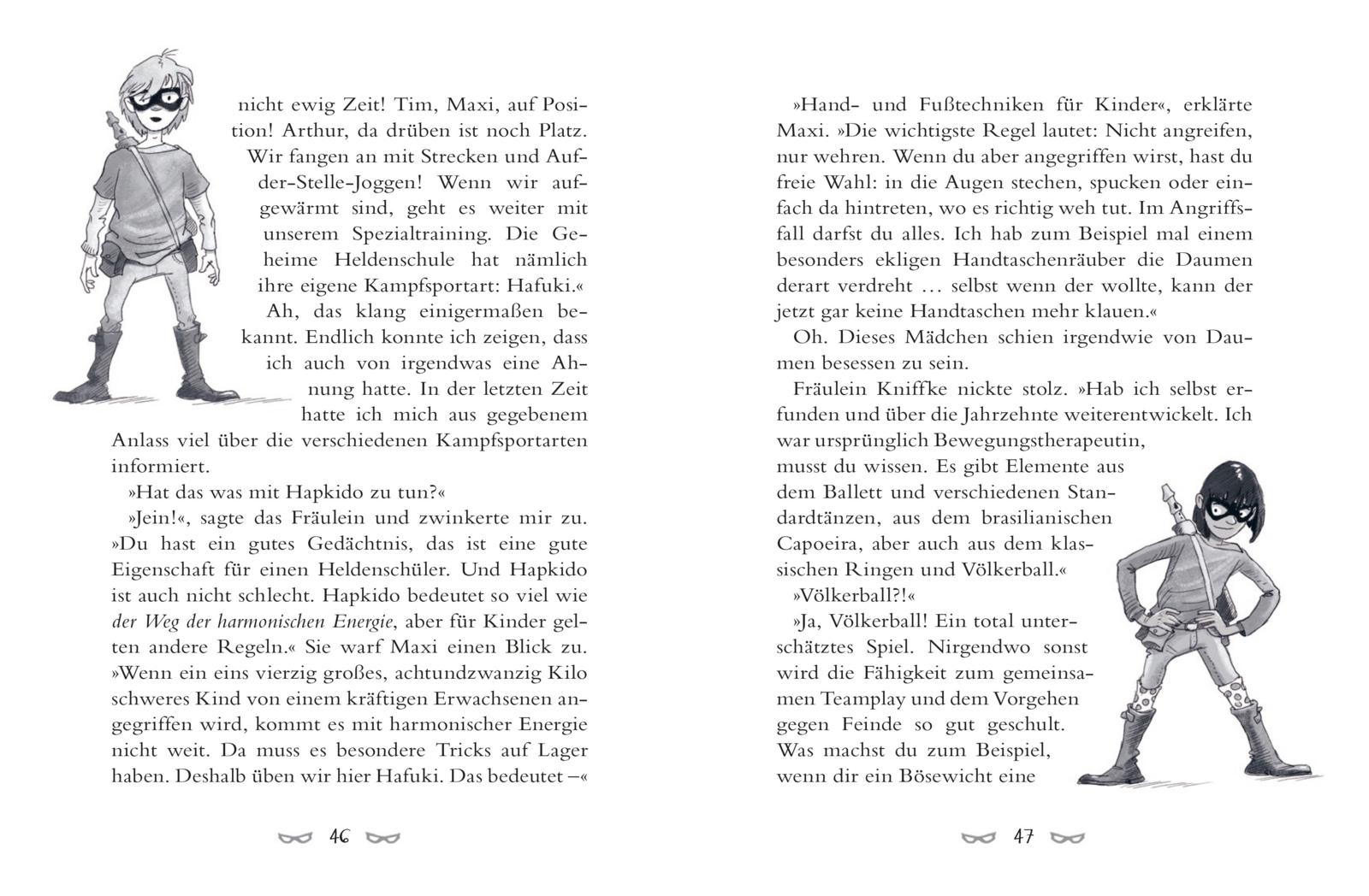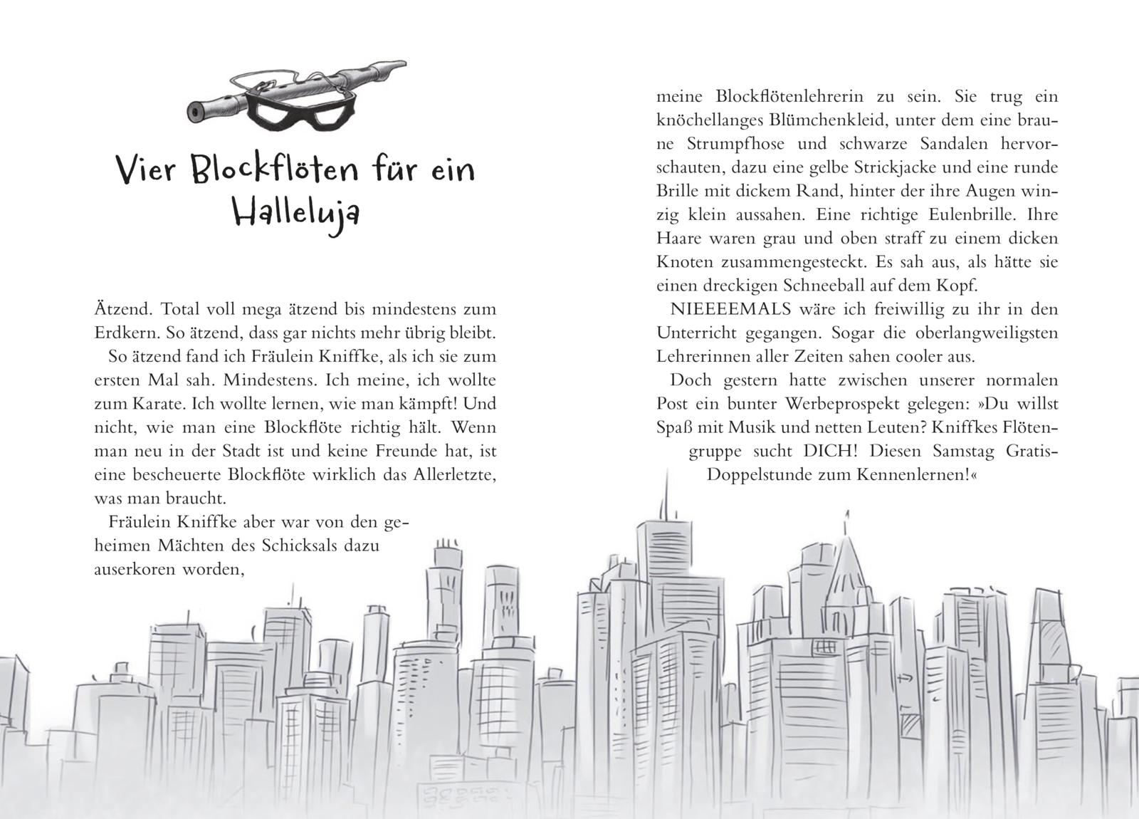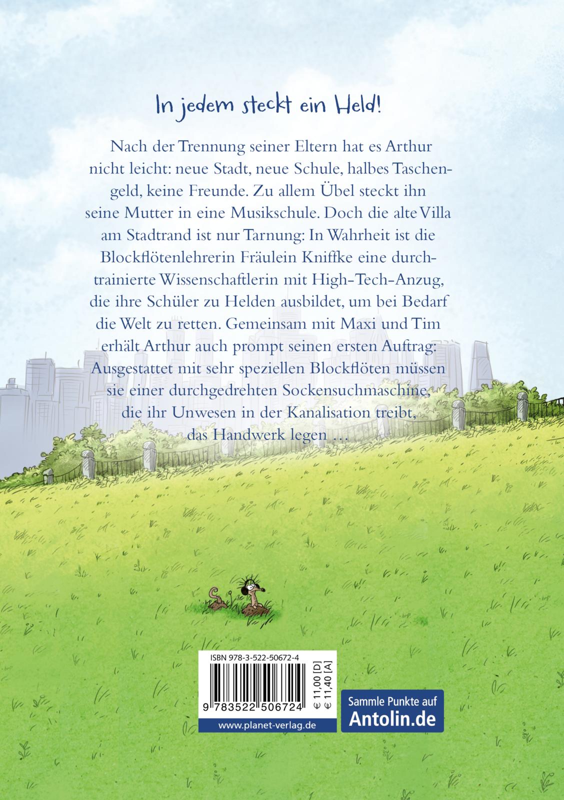 In jedem Kind steckt ein Held!Nach der Trennung seiner Eltern hat es Arthur nicht leicht: neue Stadt, neue Schule, halbes Taschengeld, keine Freunde. Zu allem Übel steckt ihn seine Mutter auch noch in eine Blockflötengruppe. Doch die Musiklehrerin Fräulein Kniffke ist in Wahrheit eine durchtrainierte Wissenschaftlerin mit High-Tech-Anzug, die ihre Schüler in der alten Villa am Stadtrand zu Helden ausbildet, um im Bedarfsfall die Welt zu retten. Zusammen mit der eigensinnigen Maxi und dem stotternden Tim, bewaffnet mit sehr speziellen Blockflöten, erhält Arthur seinen ersten Auftrag: einer durchgedrehten Sockensuchmaschine das Handwerk legen. Für alle Kinder, die selbst gerne mutiger wären, sich aber nicht trauen. Diese Geschichte macht stark!