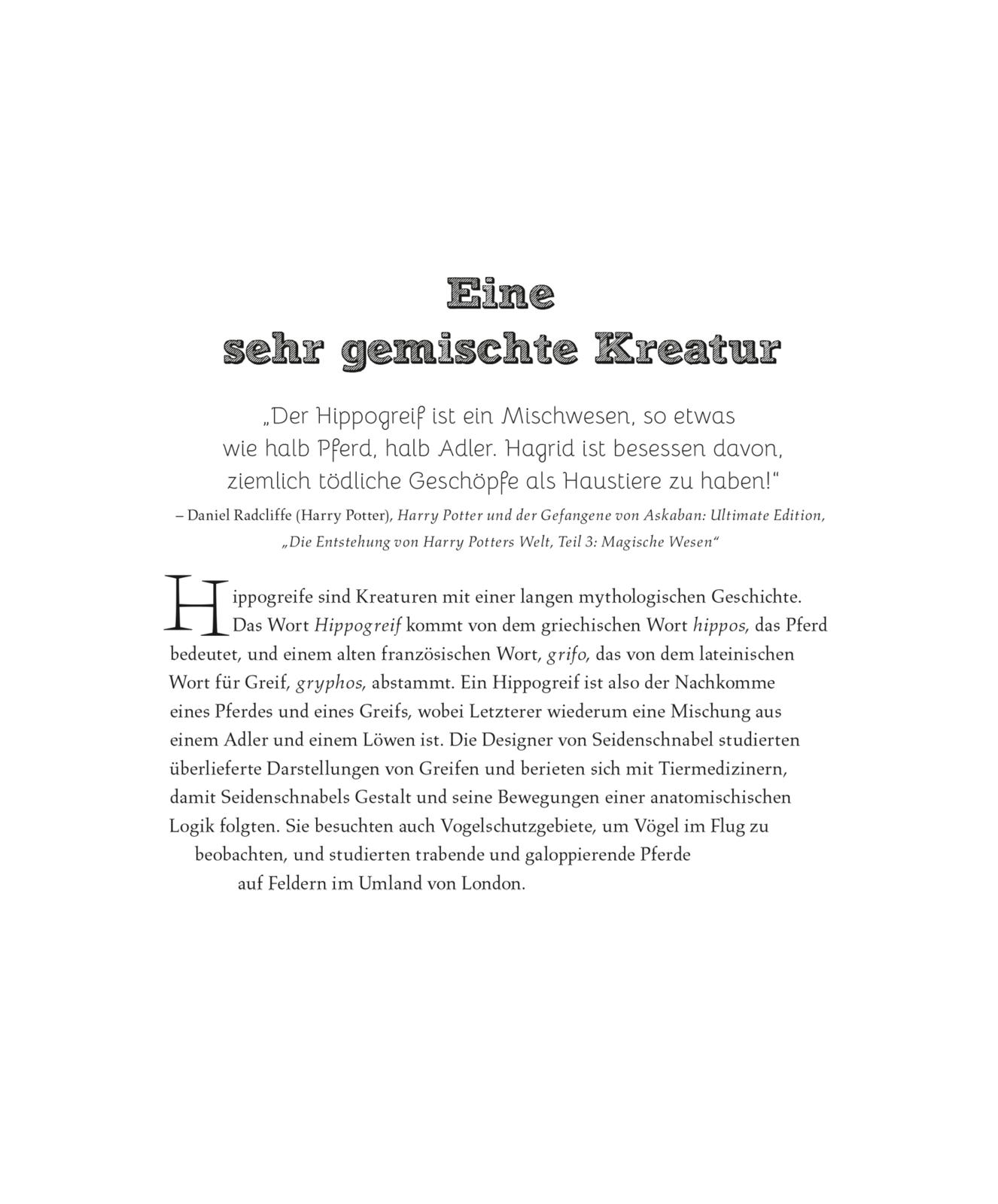 Seidenschnabel ist der berühmteste und beliebteste aller Hippogreifs. Hippogreifs gehören zu den stolzesten magischen Wesen der Zaubererwelt. Mit besonderem Fokus auf Harrys Seidenschnabel bietet dieses Buch einen spannenden Blick hinter die Kulissen, wie Hippogreifs für die Harry-Potter-Filme zum Leben erweckt wurden. Als exclusives Extra gibt es ein mitgeliefertes Do-it-yourself-3D-Puzzle aus Holz mit eurem eigenen Seidenschnabel!