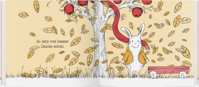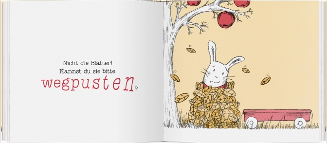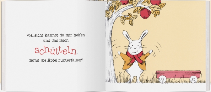 Hase hat Hunger. Aber die knackigen roten Äpfel hängen viel zu hoch. Am besten das Buch mal ordentlich schütteln, damit die Äpfel runterfallen. Und dann die Blätter wegpusten. Damit Hase mit dem schweren Wagen nicht bergauf muss, nun einfach das Buch schräg halten. Hui! Das läuft doch wie geschmiert! Neuer Mitmachspaß mit Hase! Diesmal kommt sogar das rote Lesebändchen, pardon – Hases Schal, zum Einsatz.