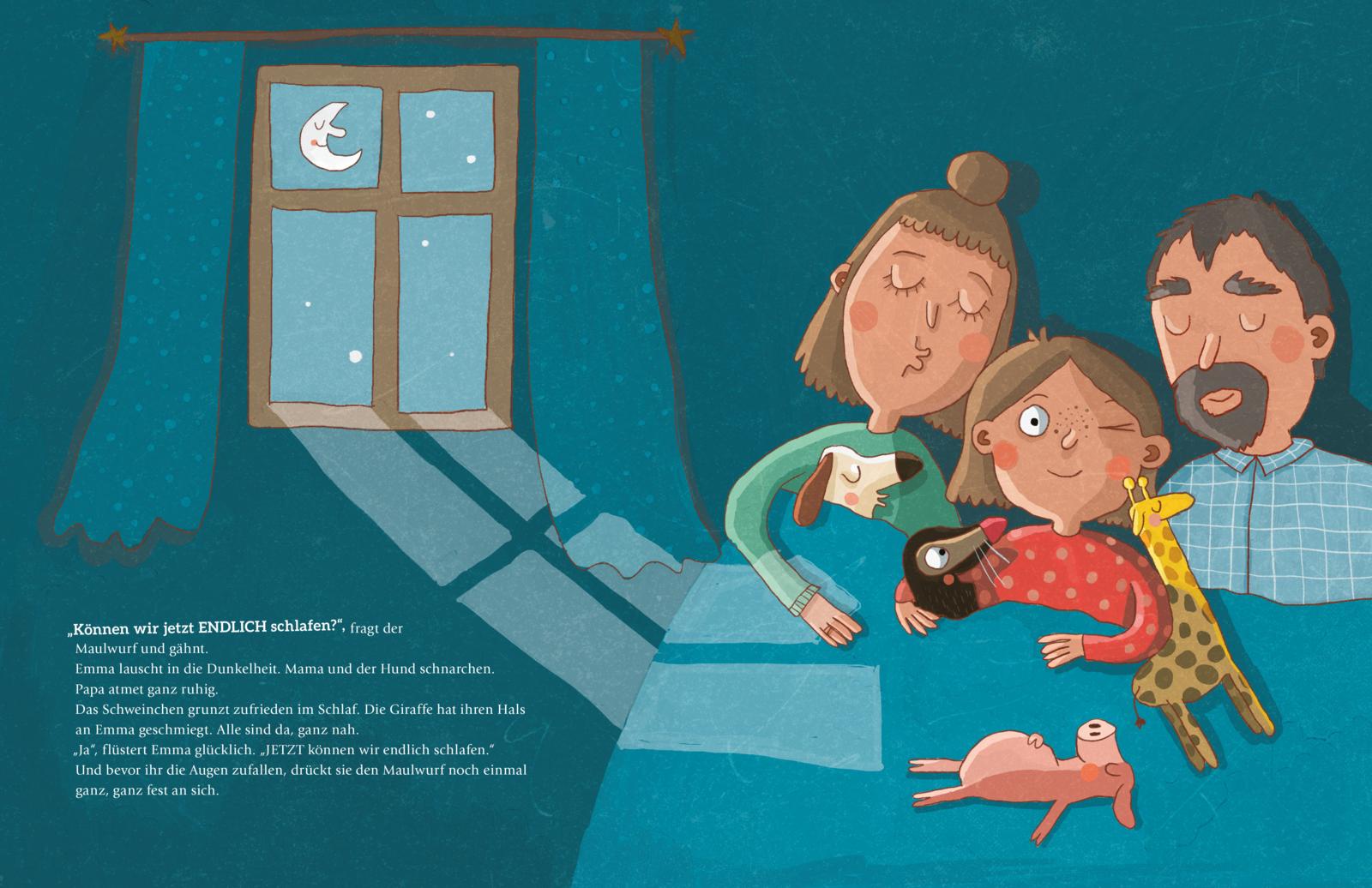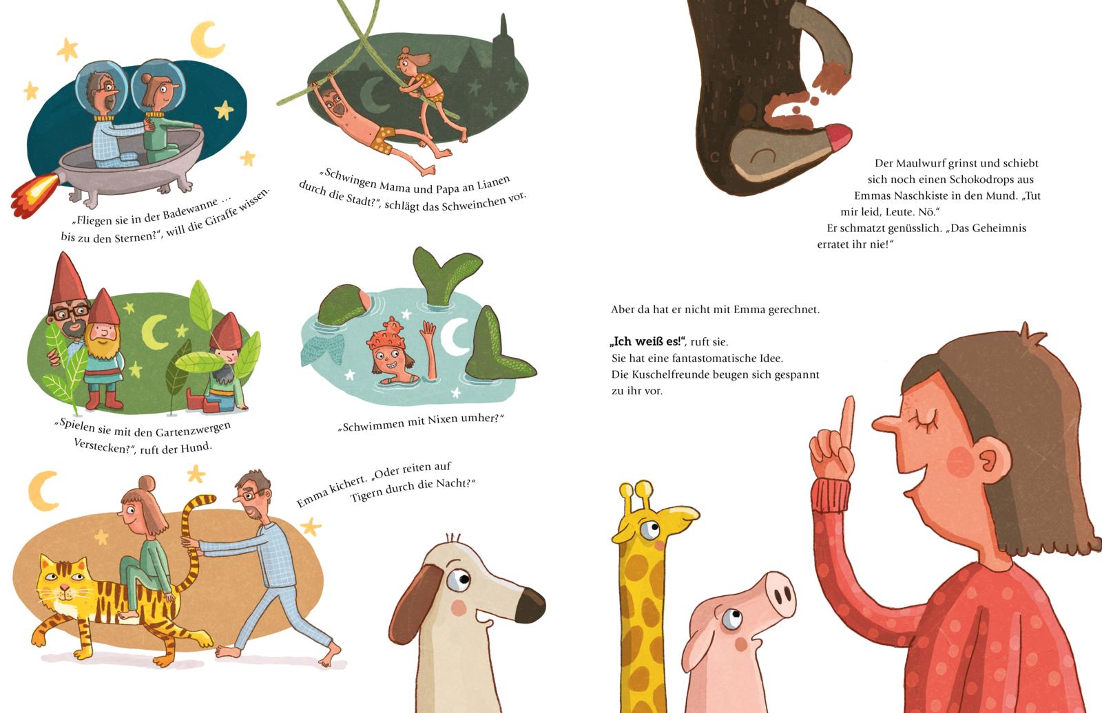 Emma muss mal wieder früh ins Bett. Dabei machen ihre Eltern nachts ganz bestimmt klammheimlich die tollsten Sachen! Auf Tigern reiten etwa, mit Nixen schwimmen oder im Keller eine gigantische Eismaschine bauen? Emma würde zu gerne wissen, was es ist. Da hilft nur wachbleiben und nachschauen! Doch so sehr sich Emma und ihre Kuschelfreunde auch bemühen – immer schlafen sie ein, bevor etwas passiert. Bis der Maulwurf DIE Idee hat. Und tatsächlich … es klappt! Als Emma endlich erfährt, was nachts vor sich geht, ist sie sicher: Das ist das schönste Geheimnis überhaupt.