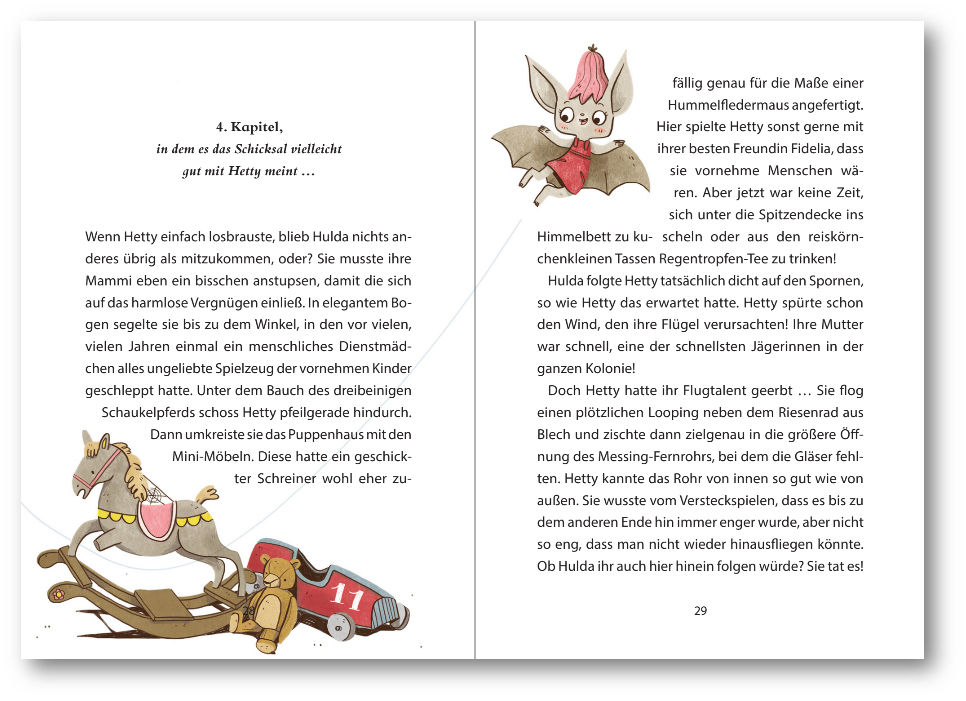 Hummelfledermaus Hetty hat eine neue Idee: Sie beschließt, ab sofort jeden Tag eine gute Tat zu vollbringen. Natürlich findet ihre Freundin Fidelia das super, und auch Möppelchen Pi, der Etrusker-Spitzmäuserich, will mitmachen. Auf der Suche nach jemandem, den sie mit einer guten Tat beglücken können, durchsuchen sie den Schlosspark von La Rondine. Doch die sonst so belebte Wiese ist wie ausgestorben. Was ist passiert? Steckt das schreckliche Ungeheuer, das angeblich im Palmenhaus wohnt, dahinter? Klar, dass Hetty der Sache auf den Grund geht!