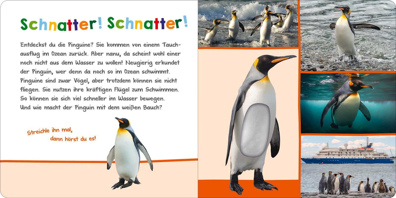 Der kleine, freche Delfin springt quietschend und pfeifend aus dem Wasser. Doch was für Geräusche machen Pinguine, Fischotter, Silbermöwen und Buckelwale? Hier kannst du sie entdecken. Einfach über Haut und Fell der Tiere streicheln und schon wird der Ozean lebendig. Das Fühlbuch mit vielen tollen Fotos und hochwertigen Soundmodulen begeistert schon die Kleinsten und macht das gemeinsame Vorlesen zum interaktiven Erlebnis für alle Sinne.