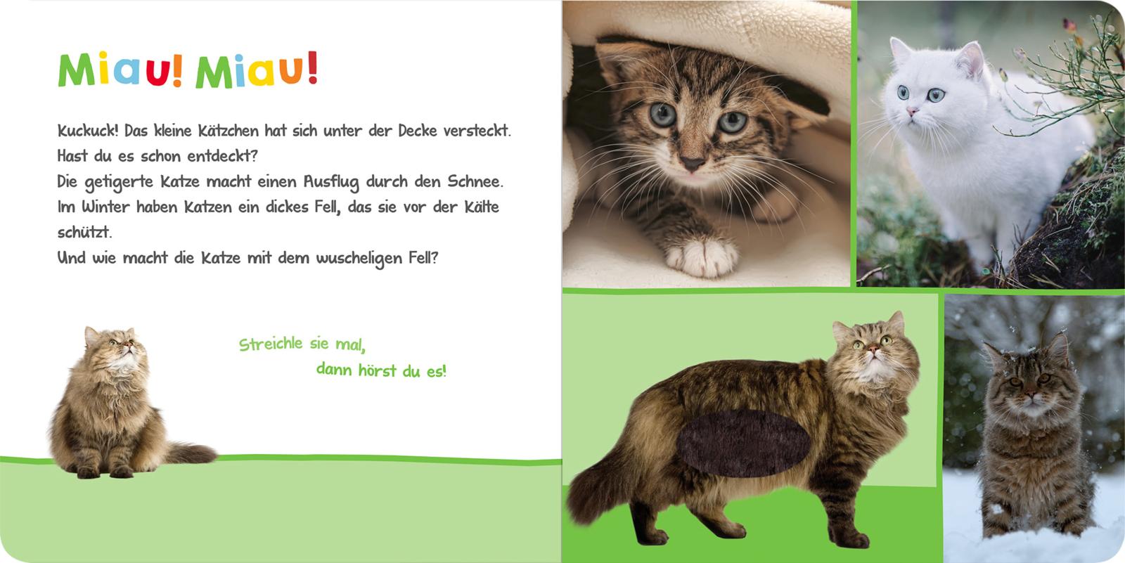 Auf jeder Doppelseite wird ein kuscheliges Tier mit vielen anschaulichen Fotos und einem kurzen Sachtext vorgestellt. Das weiche Fell lädt zum Fühlen ein und beim Darüberstreicheln wird das passende Tiergeräusch ausgelöst. Das ist nicht nur spannend, sondern fördert auch die Hand-Auge-Koordination, die Lautbildung und das Sprechen. Das Fühlbuch mit Sound eignet sich für Kinder ab 6 Monaten.