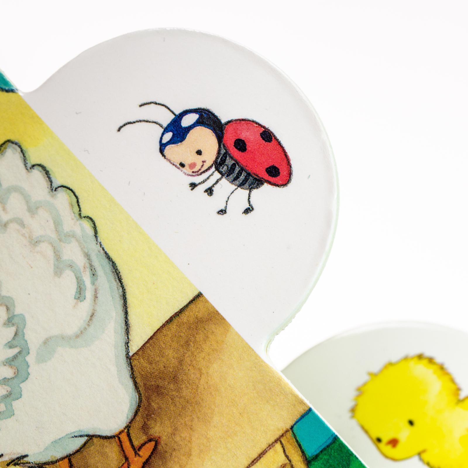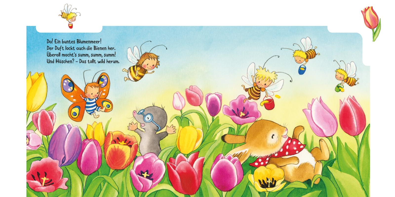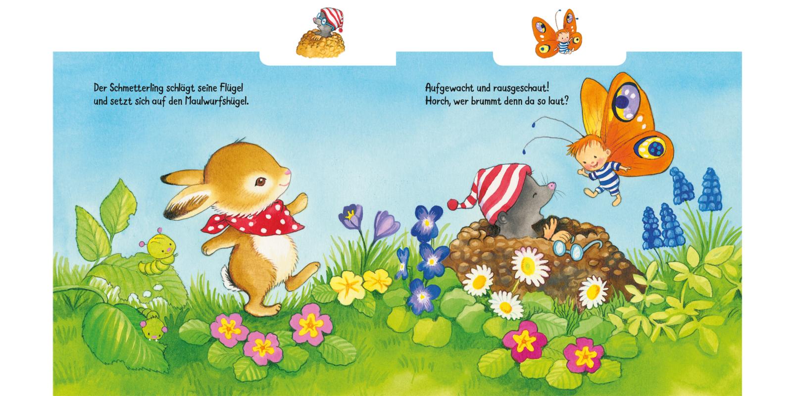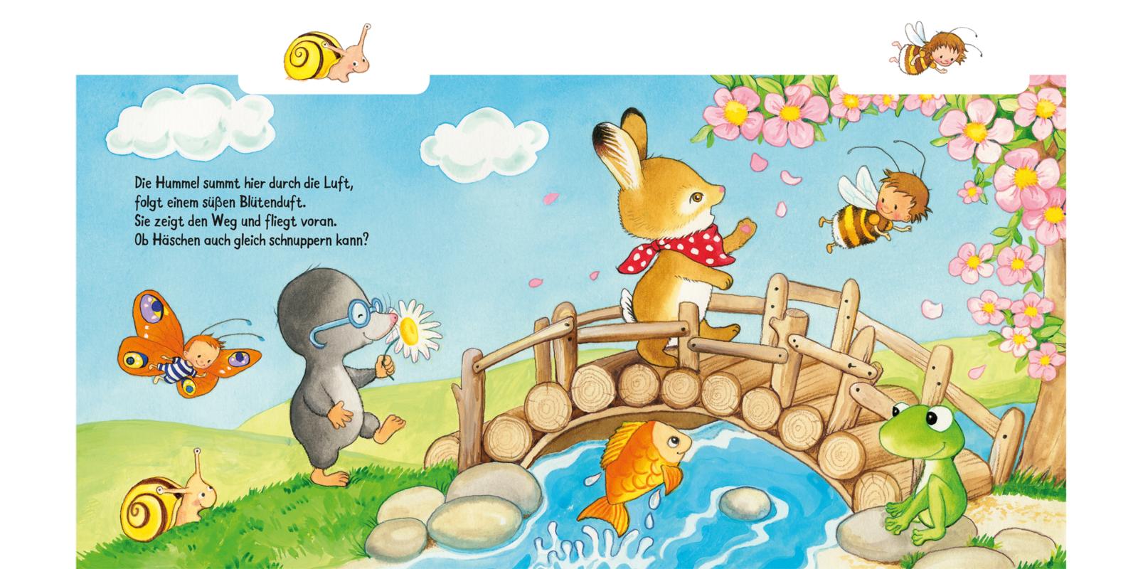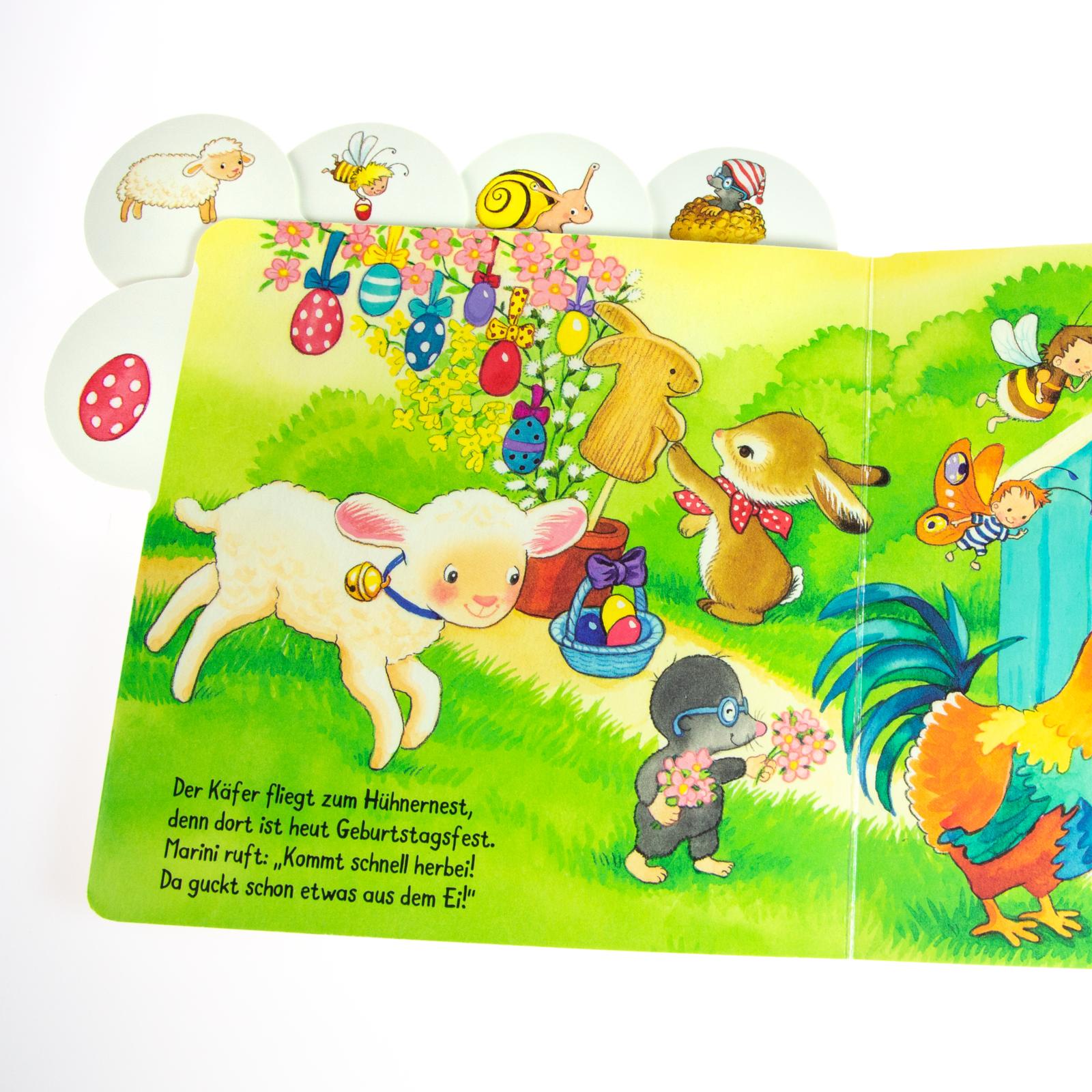 Neugierig erkundet es gemeinsam mit Schmetterling, Maulwurf, Hummel, Schäfchen, Biene und Marienkäfer Wiesen und Felder und entdeckt schließlich neben allerlei bunt gemalten Eiern in einem Nest ein Hühnerei.