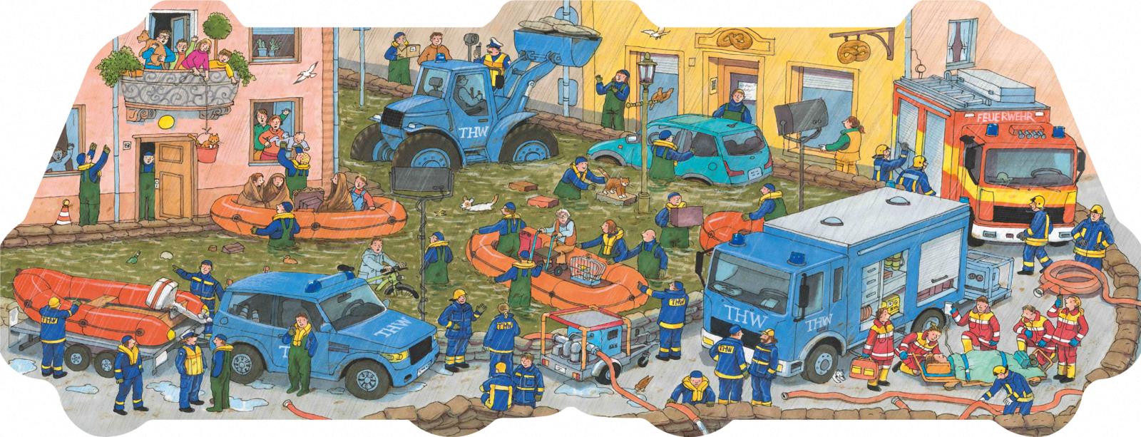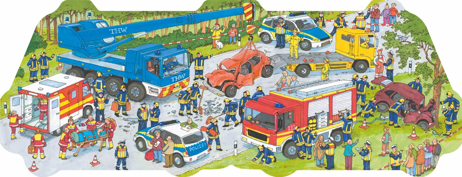 Ob Verkehrsunfall, Hochwasser, Brand oder Einbruch – die Retter von Polizei, Feuerwehr, Krankenwagen und vom Technischen Hilfswerk sind gleich zur Stelle. In wimmeligen, detailreichen und großformatigen Bildern kann man sich die Rettungsfahrzeuge genau anschauen und erfährt, wann sie zum Einsatz kommen und wie sie zusammenarbeiten. Die Suchaufgaben fordern zum genauen Hinsehen auf, das ist spannend und fördert die Konzentrationsfähigkeit.