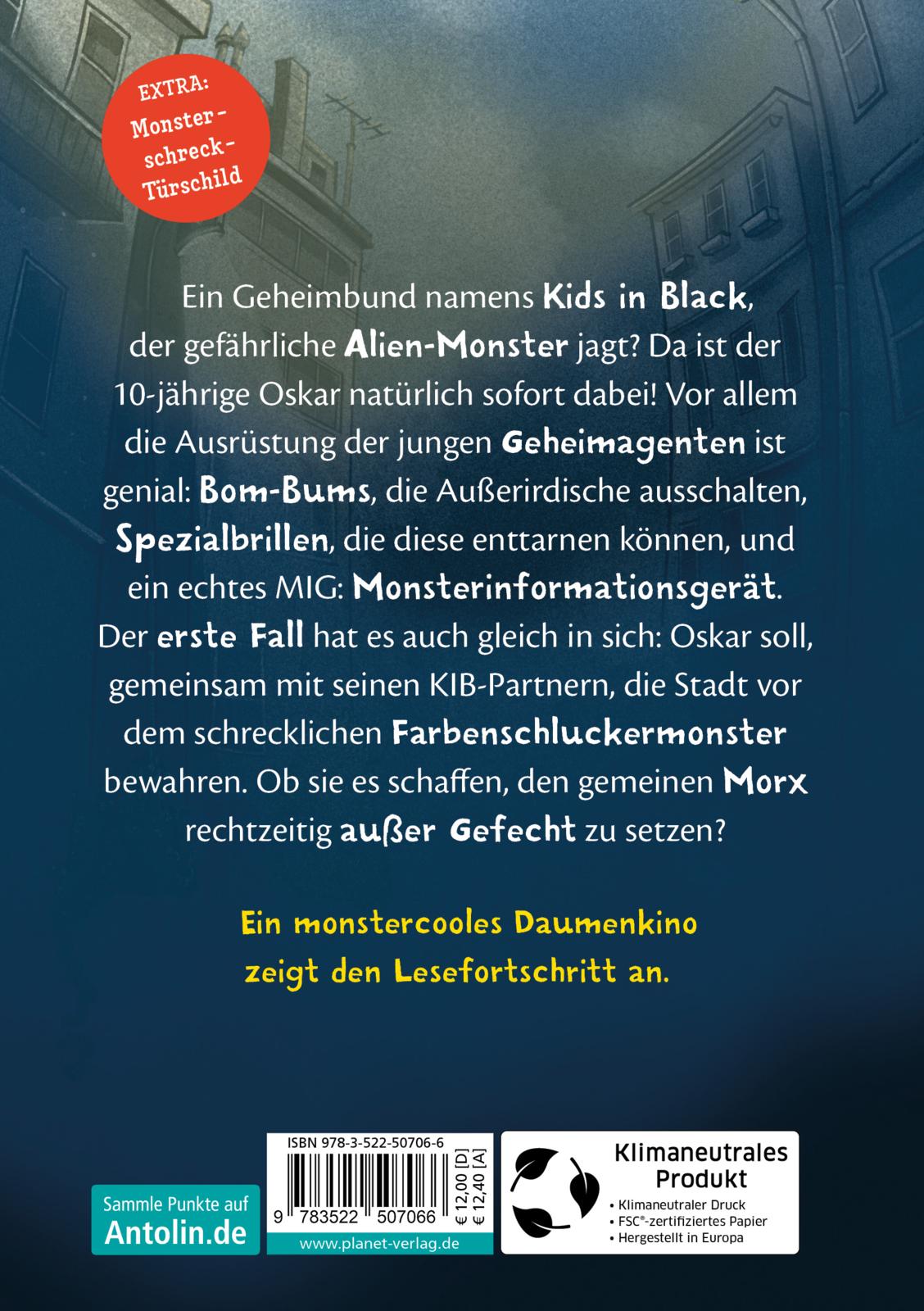 Ein Geheimbund namens „Kids in Black“, der gefährliche Alien-Monster jagt? Da ist der 10-jährige Oskar natürlich sofort dabei! Vor allem die Ausrüstung der jungen Geheimagenten ist genial: Bom-Bums, die Außerirdische ausschalten, Spezialbrillen, die diese enttarnen können, und ein echtes MIG: Monsterinformationsgerät. Der erste Fall hat es auch gleich in sich: Oskar soll, gemeinsam mit seinen KIB-Partnern, die Stadt vor dem schrecklichen Farbenschluckermonster bewahren. Ob sie es schaffen, den gemeinen Morx rechtzeitig außer Gefecht zu setzen?