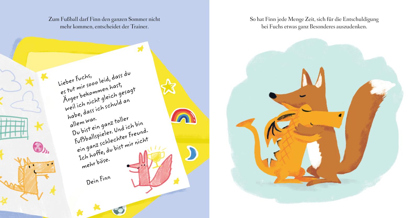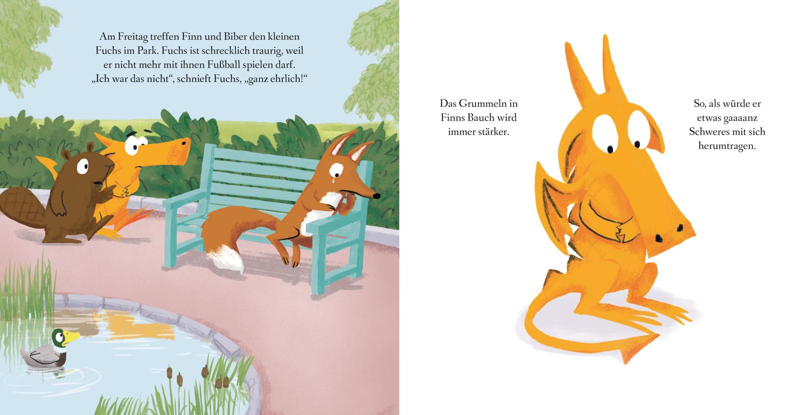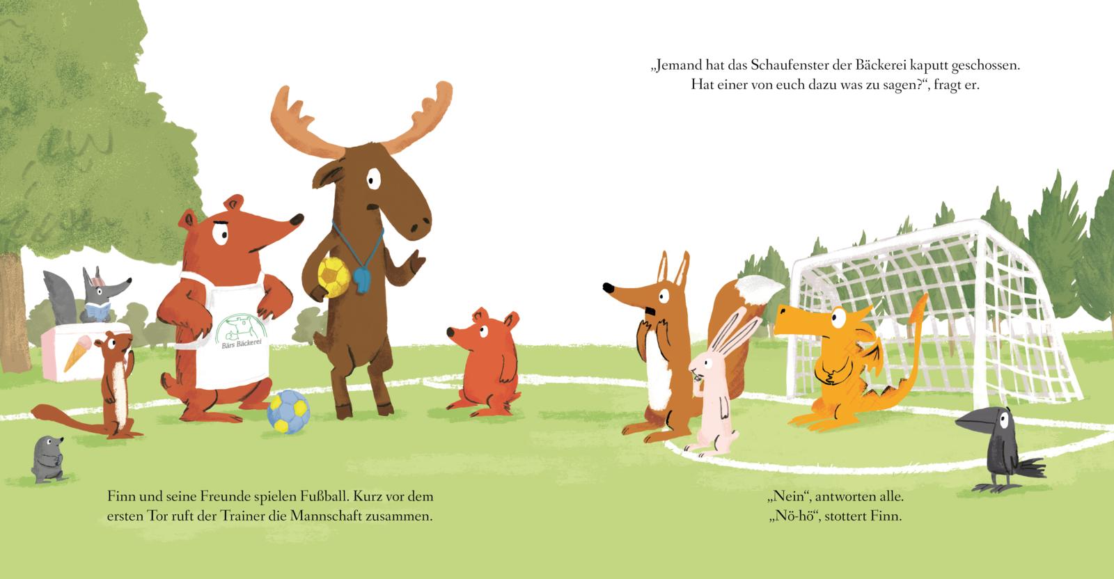 Wie jedes Kind sagt auch Finn nicht immer die Wahrheit. Doch als er aus Versehen das Fenster der Bäckerei kaputtschießt und alle Finns Freund, den kleinen Fuchs, verdächtigen, wird aus einer klitzekleinen Lüge etwas Riesengroßes. „Ich hab damit nichts zu tun!“, schwindelt Finn – und bekommt ein mächtig schlechtes Gewissen, weil der kleine Fuchs nicht mehr zum Fußball-Training darf. Finn fühlt sich so drachenelend, dass er nicht mal Abendessen möchte. Da fasst sich der kleine Drache schließlich doch ein Herz …