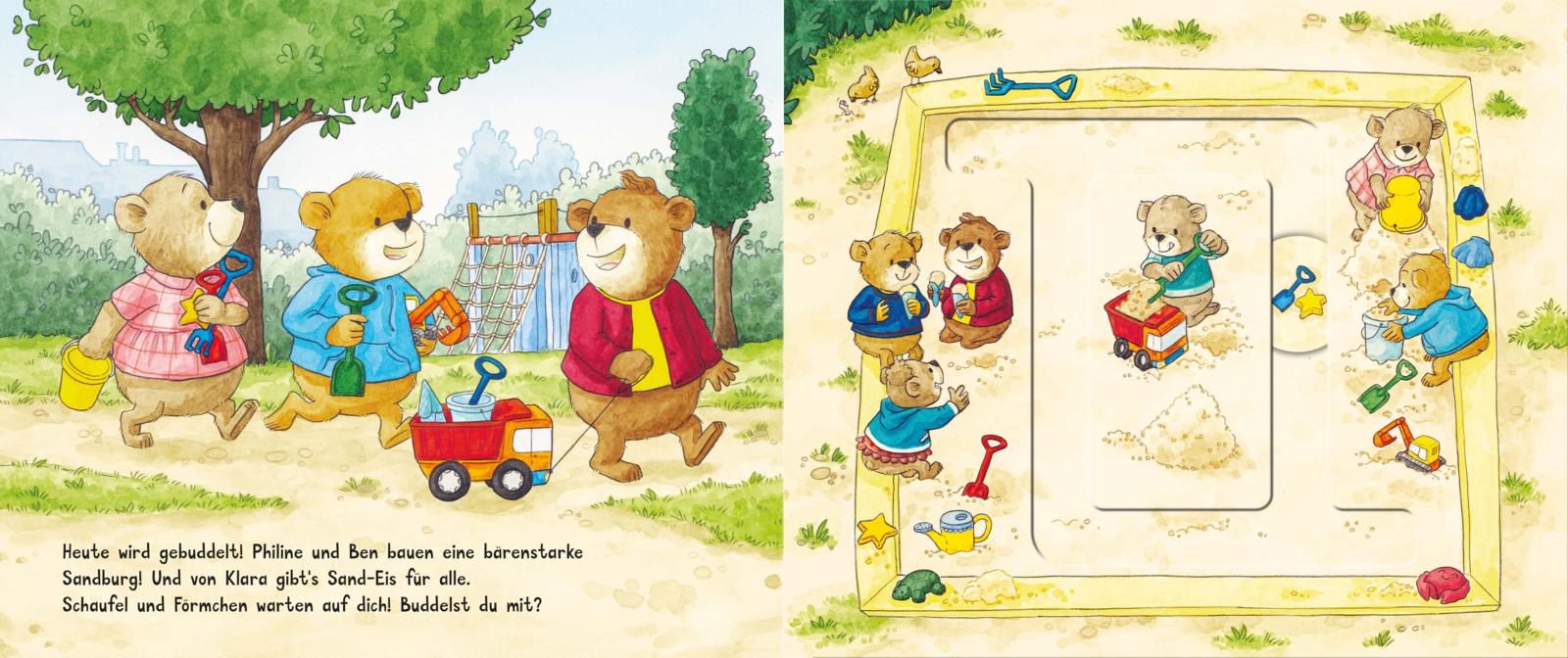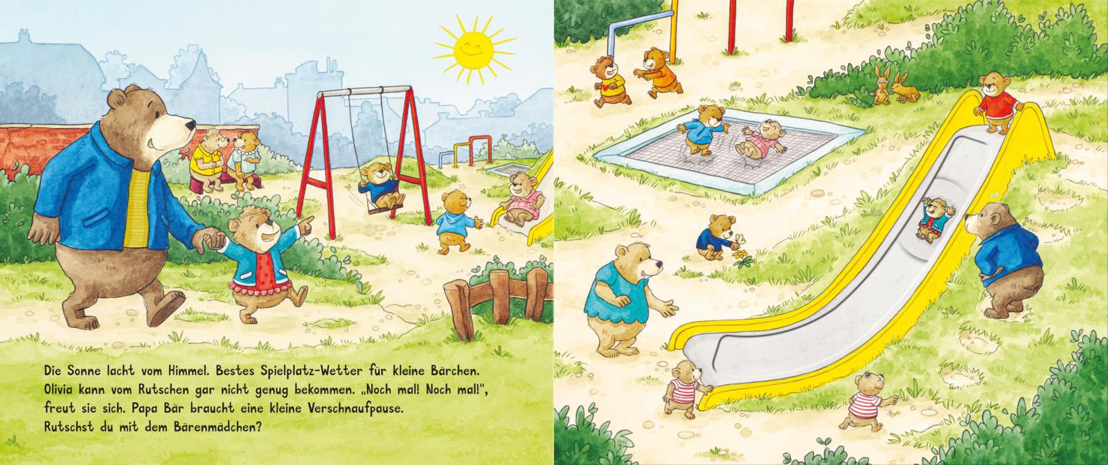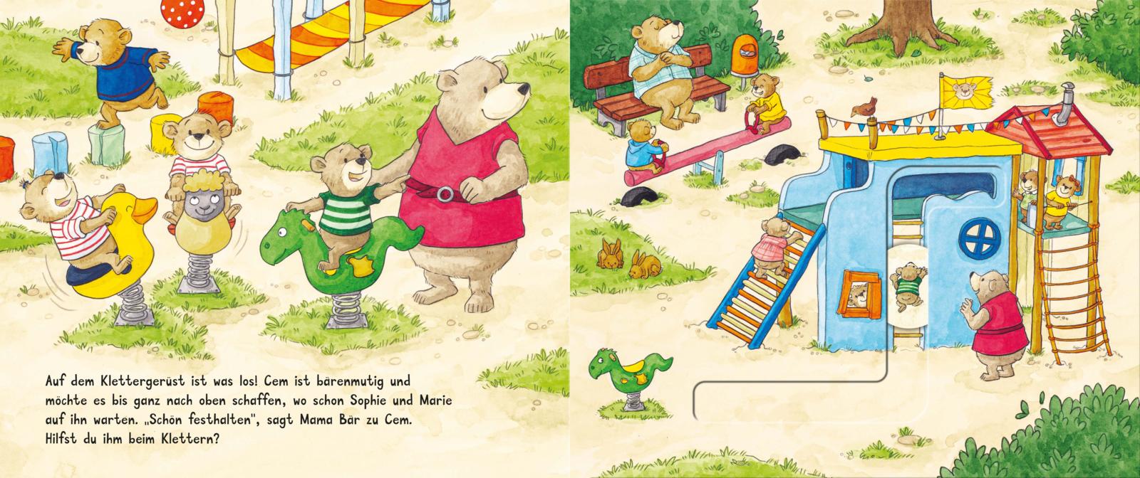 Komm mit! Auf dem Spielplatz gibt es für die Kleinsten jede Menge zu erleben: rutschen, klettern, Karussell fahren oder Sandkuchen backen. Davon können die Bärenkinder Olivia, Teddy, Sophie und Cem gar nicht genug bekommen. Auf jeder Doppelseite können Kinder ab 18 Monaten sie aktiv unterstützen und mithelfen. Ganz einfach lassen sich die kleinen Bären auf der Rutsche oder auf dem Klettergerüst mithilfe der großen Schiebe-Elemente hin und her schieben. Die Schiebeelemente sind so gestaltet, dass auch Kleinkinder sie selbstständig bewegen können.