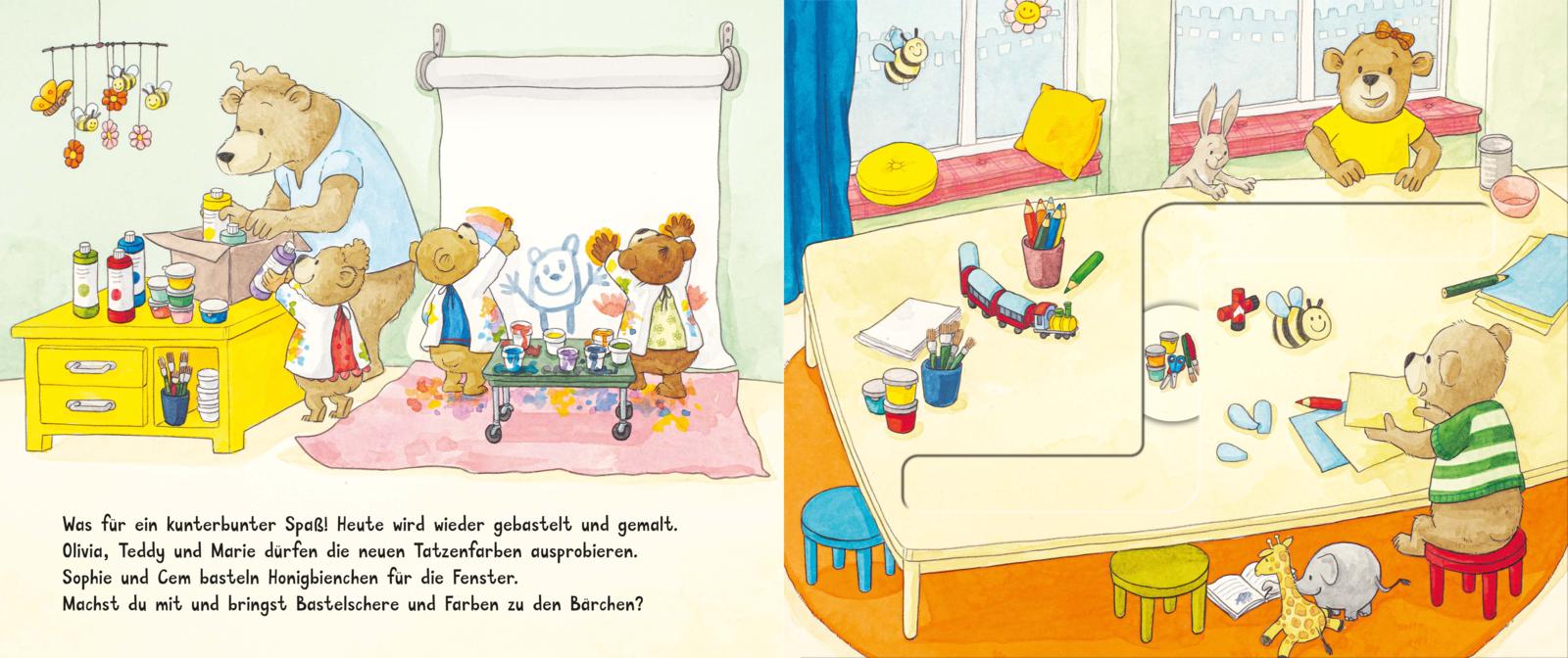 Komm mit! In der Kita ist jeder Tag ein Abenteuer! Fröhlich begrüßen sich die Bärenkinder im Morgenkreis, kunterbunt wird es beim Malen und Basteln mit Tatzenfarben und wenn zur Mittagszeit die Bäuchlein brummeln, wartet ein leckeres Essen. Auf jeder Doppelseite können Kinder ab 18 Monaten Olivia, Teddy, Sophie und Cem unterstützen und den Tag in der Kita aktiv miterleben. Ganz einfach lassen sich die Bären, ihre Spielsachen und sogar das Schnuffeltuch für den Mittagsschlaf mithilfe der großen Schiebe-Elemente ganz einfach hin- und herbewegen. Die Schiebeelemente sind so gestaltet, dass auch Kleinkinder sie selbstständig bewegen können.