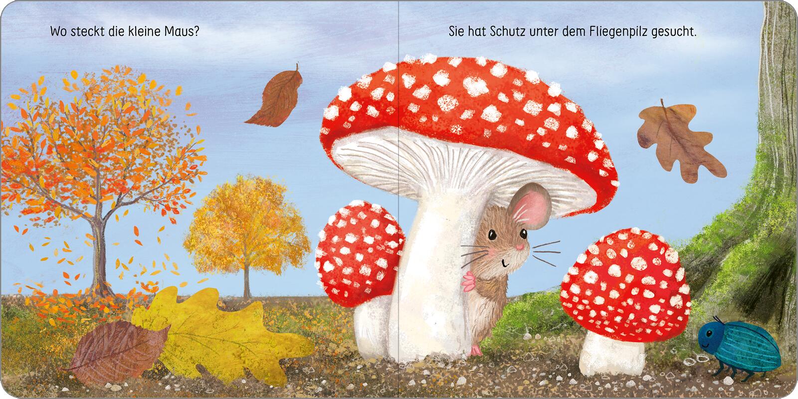 Das kleine Eichhörnchen hat sich hinter Mamas buschigem Schwanz versteckt. Der Hase sitzt in seinem Bau. Siehst du seine langen Ohren? Und wo sind die Maus, das Rotkehlchen und der Dachs? Schau genau, dann kannst du sie entdecken!
